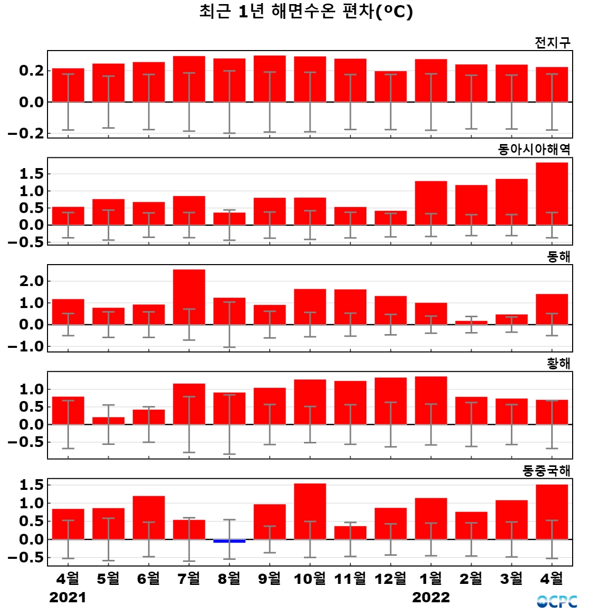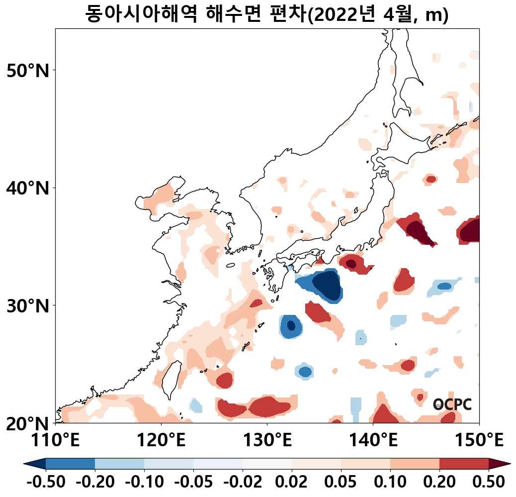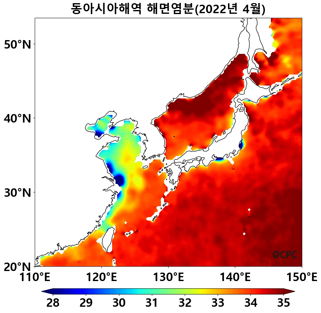 동해는 평년(7.7°C)보다 1.4°C, 동중국해는 평년(18.6°C)보다 1.5°C 높았으며, 지난 30년(4월) 중 가장 높았습니다.