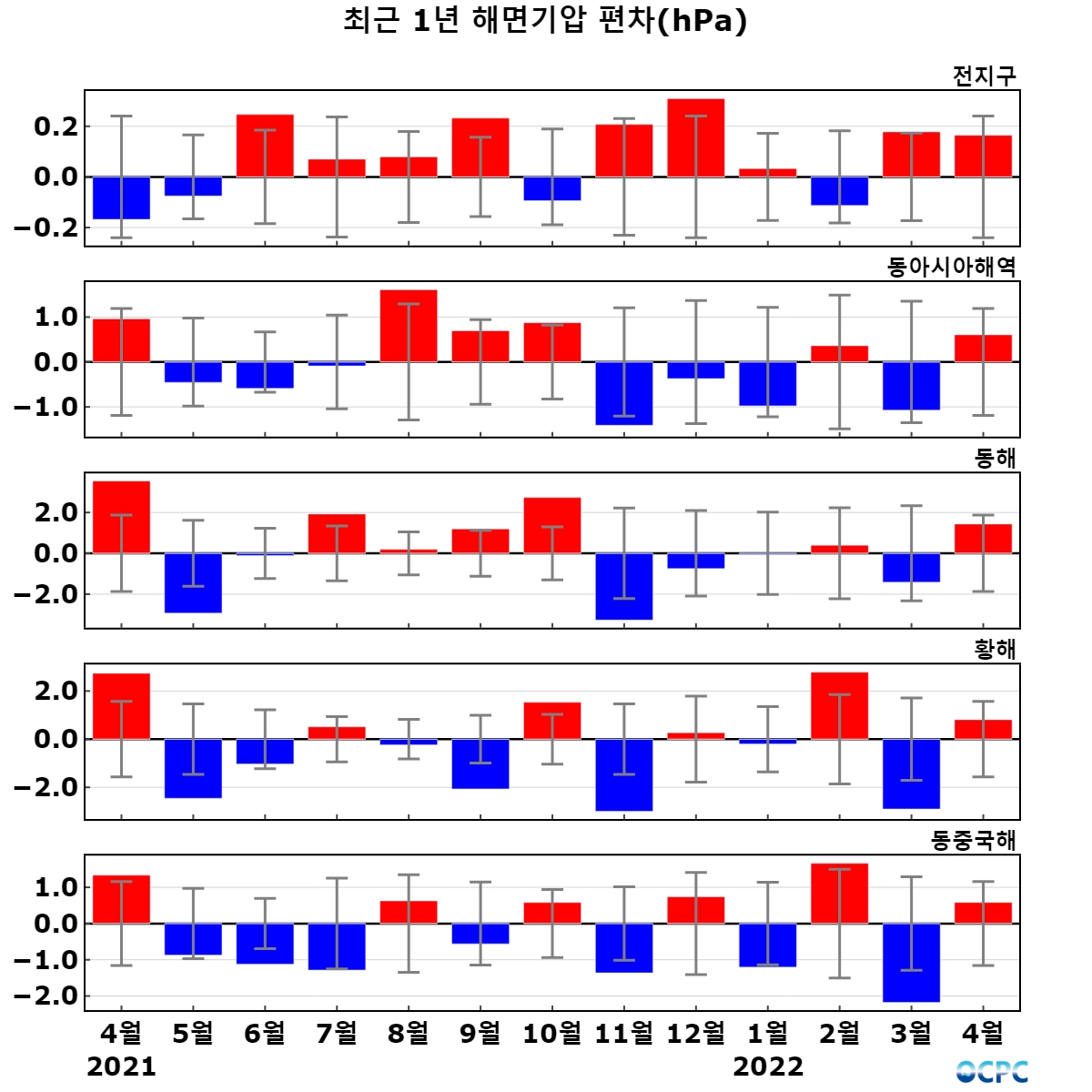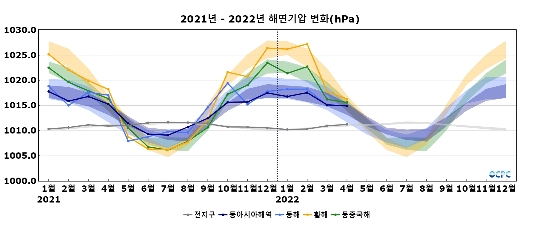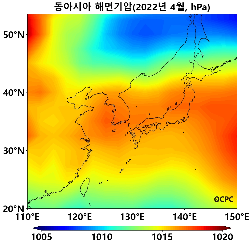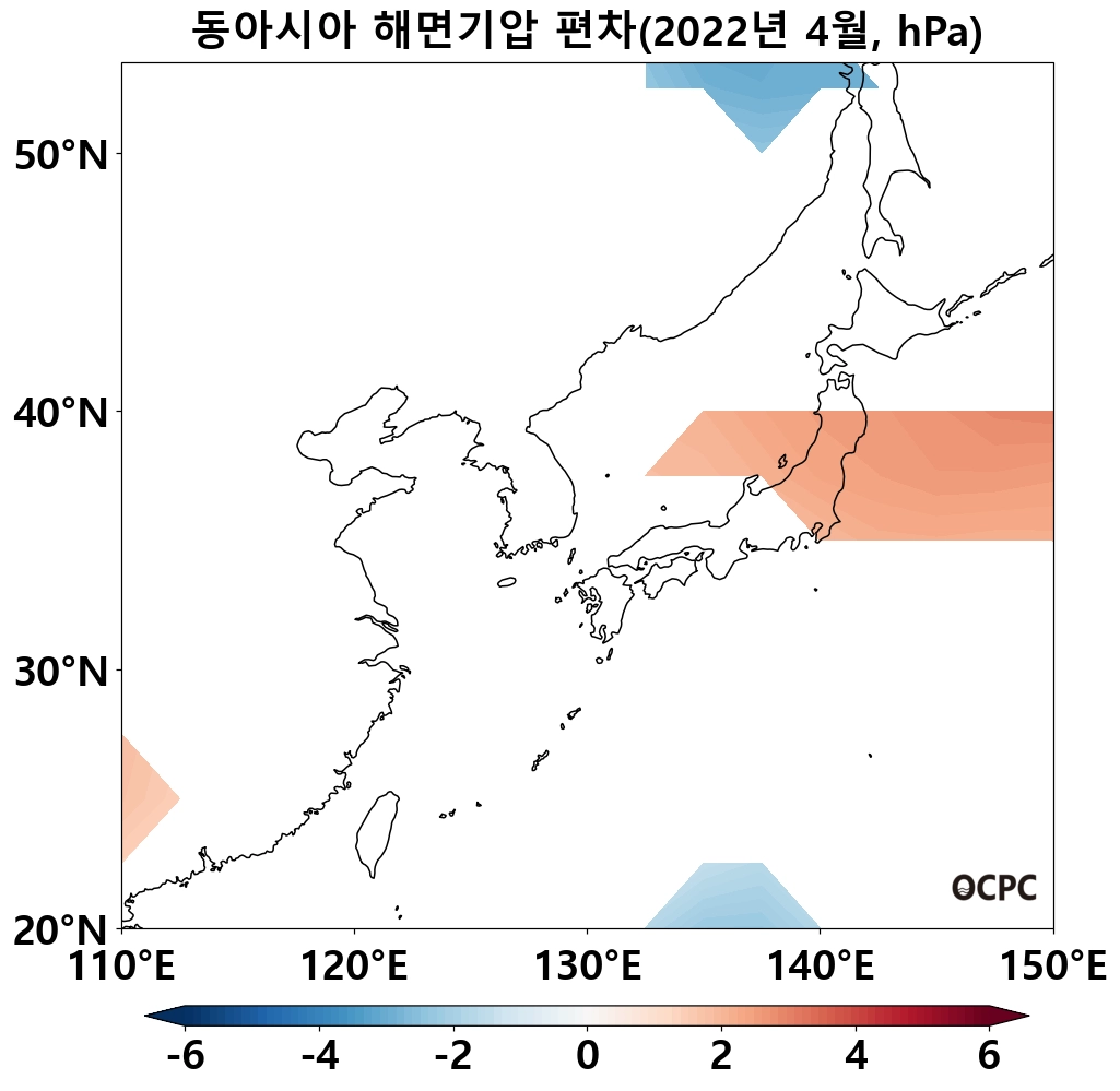 최근 30년 동안 동아시아해역, 동해, 황해, 동중국해의 4월 해면기압은 10년에 0.3~0.5hPa씩 증가하는 추세입니다.
