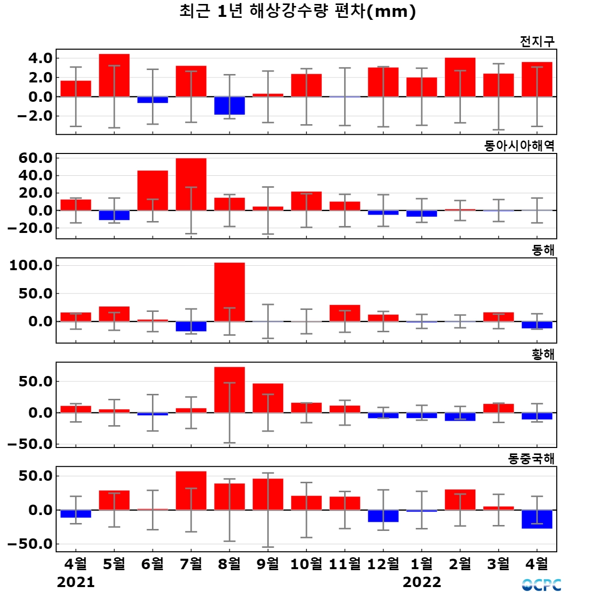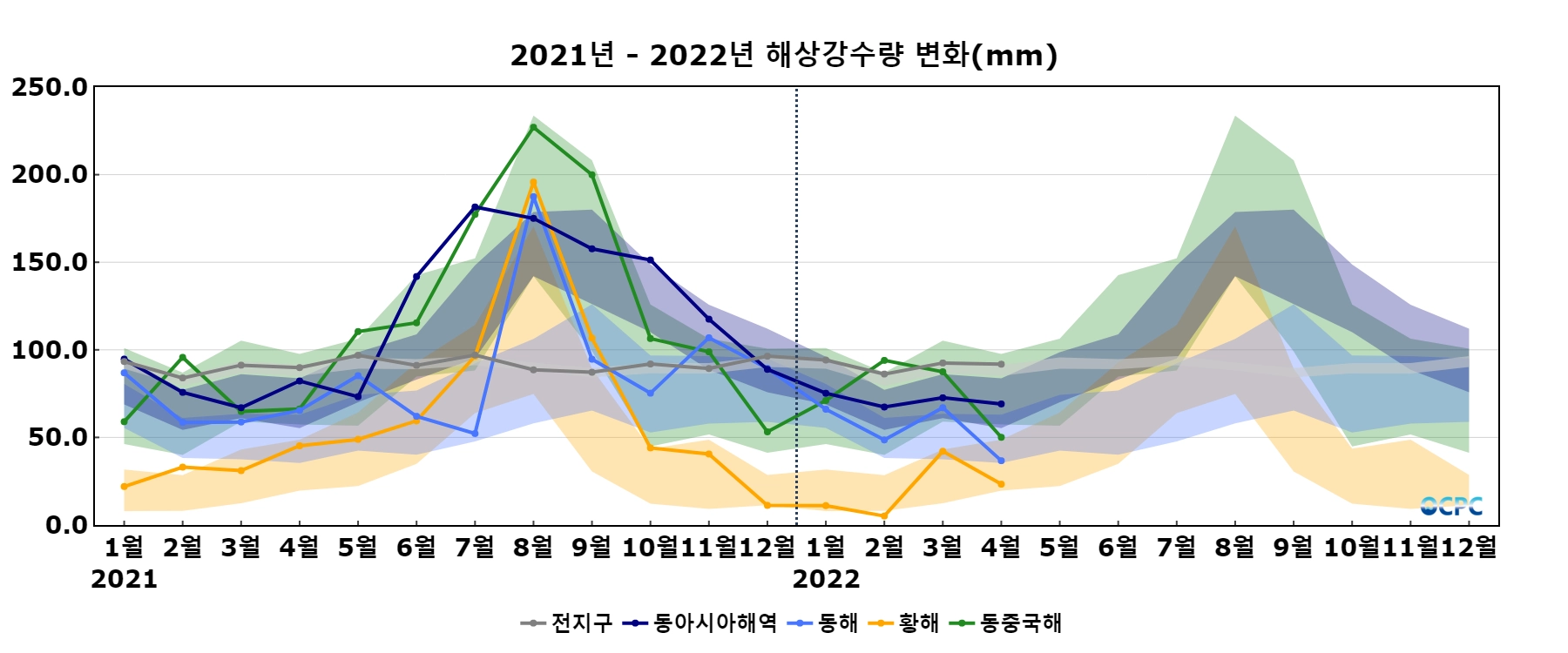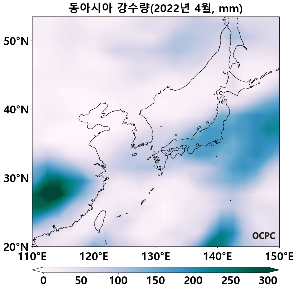 최근 30년 동안 전지구, 동해, 황해의 4월 해상강수량은 10년에 0.2~3.9mm씩 증가하는 추세이나, 4월 해상강수량이 상대적으로 많은 동중국해가 10년에 2.3 mm씩 감소하고 있어 동아시아 해역의 해상강수량도 10년에 0.3mm씩 감소하고 있습니다.