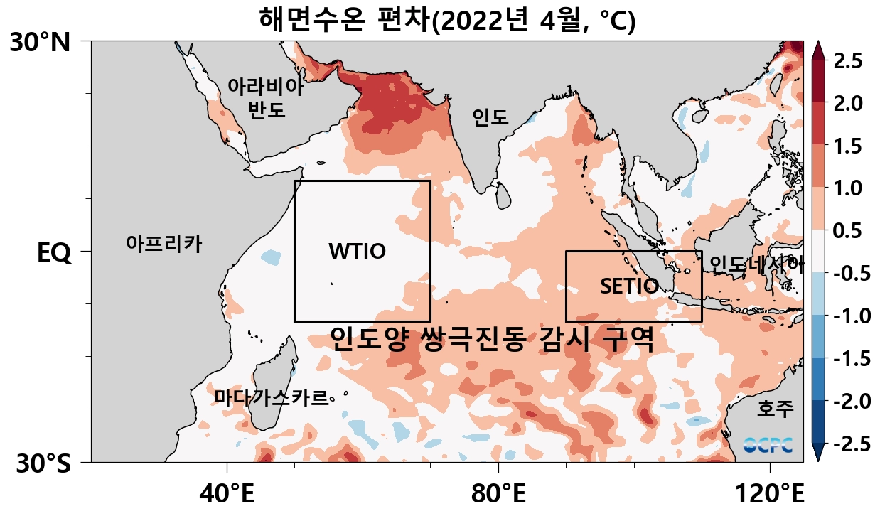 2022년 4월 평균 해면수온의 평년 대비 편차 (사각형은 인도양 쌍극진동 감시구역으로 각각 WTIO(열대서인도양), SETIO(열대 남동인도양) 해역이며, 인도양 쌍극진동 지수(DMI: Dipole Mode Index)는 WTIO의 평년 대비 편차에서 SETIO의 평년 대비 편차를 뺀 값입니다.)
