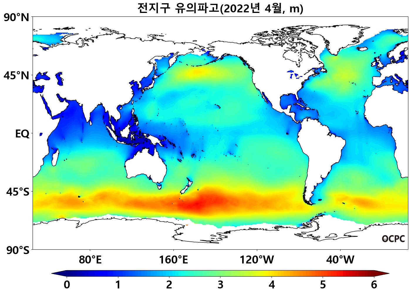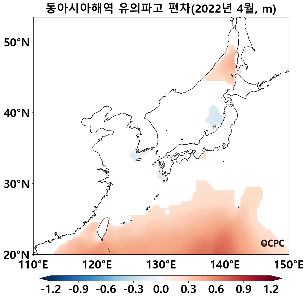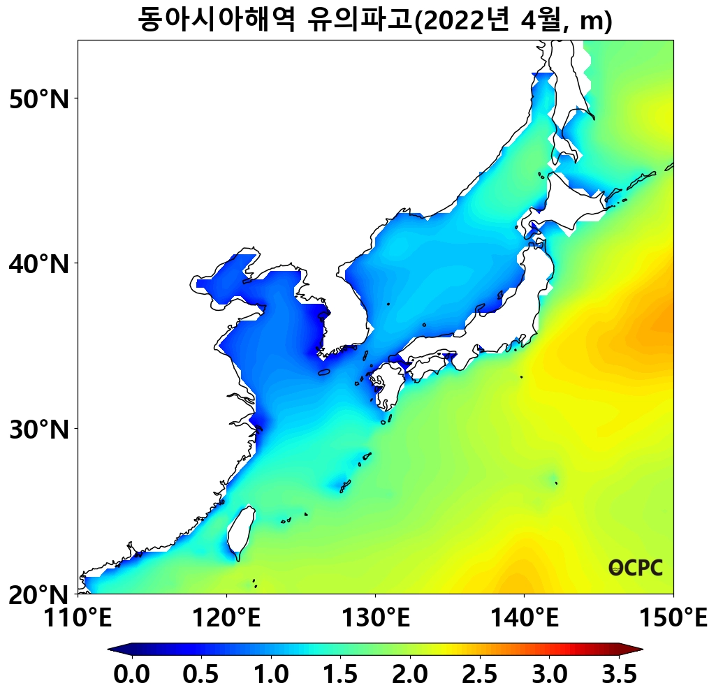 최근 30년 동안 4월 전지구 평균 유의파고는 10년에 1.4cm씩 감소하는 추세이며, 동아시아해역은 10년에 2.8cm씩 증가하는 추세입니다.