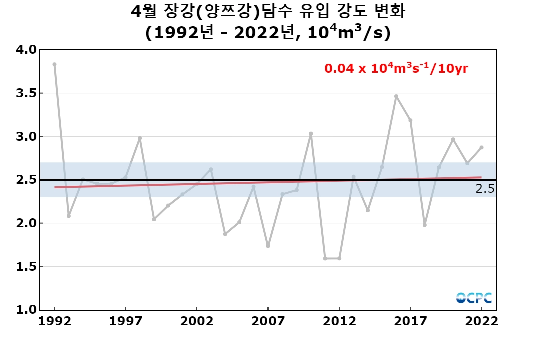최근 30년 4월 장강 담수 유입 강도는 10년에 0.4톤씩(한달간 유입된 담수량으로 환산하면 10년에 1.0기가톤씩) 증가하는 추세입니다.