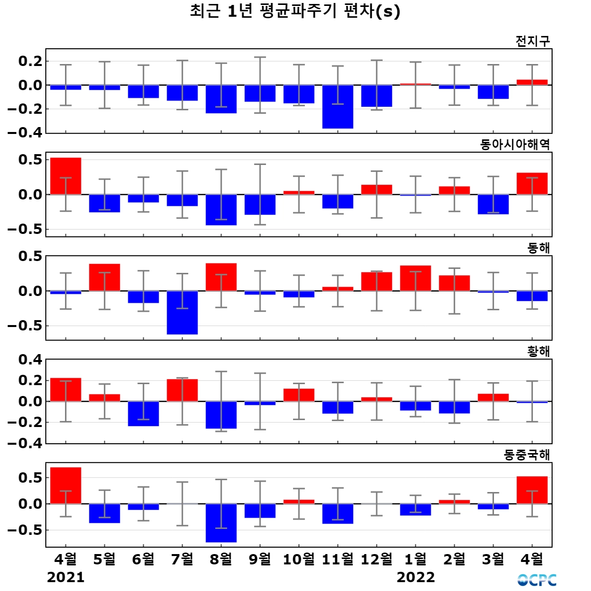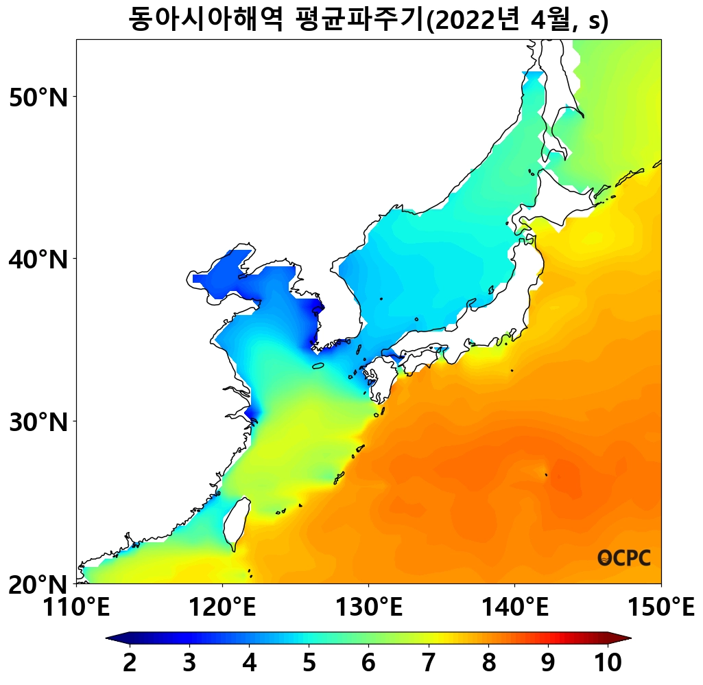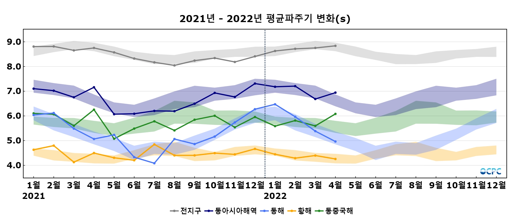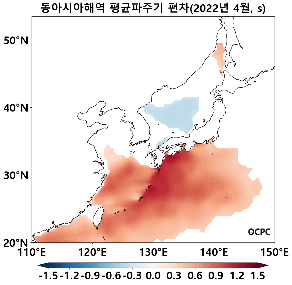 동해, 황해의 평균파주기는 평년(5.1초, 4.3초)과 비슷했으며, 동중국해는 평년(5.6초)보다 0.5초 길었습니다.
