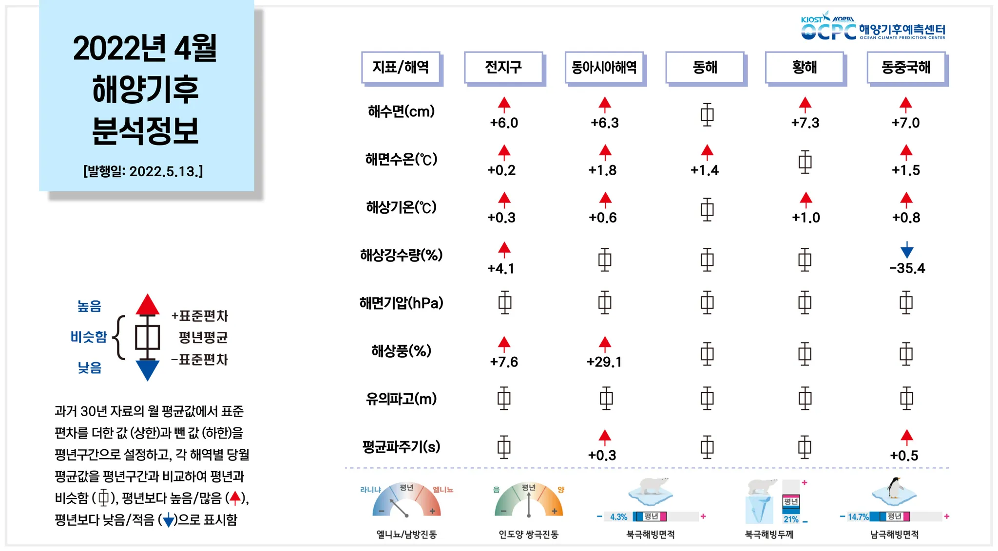 전지구 평균 해상기온은 평년(16.4°C)보다 0.3°C 높았으며, 북극해와 남극해(로스해)의 해상기온이 두드러지게 높았습니다.