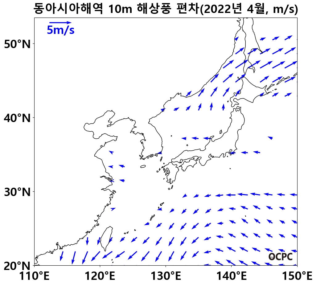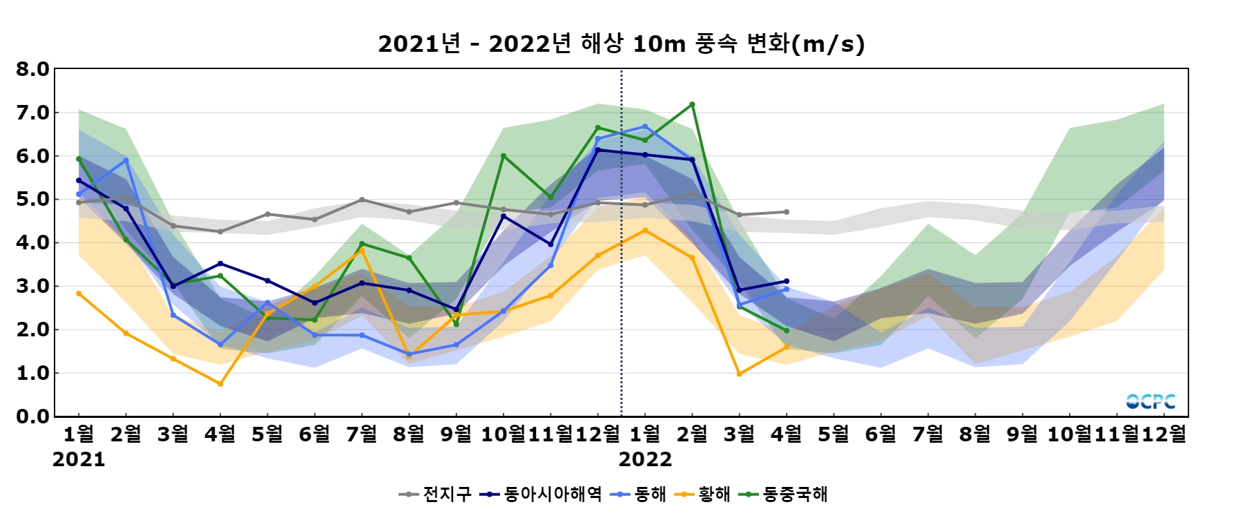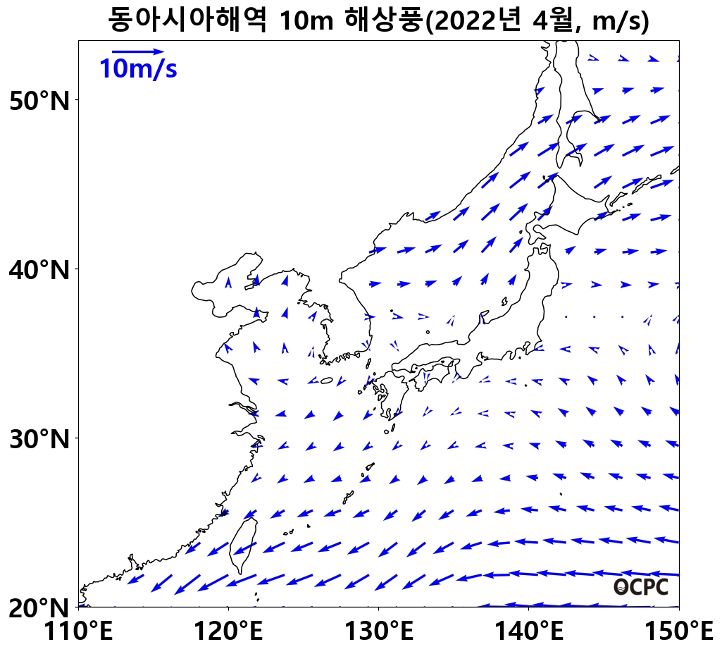 최근 30년 동안 동아시아해역 4월 해상풍속은 10년에 0.1m/s씩 증가하는 추세이며, 황해는 10년에 0.1m/s씩 감소하는 추세입니다.