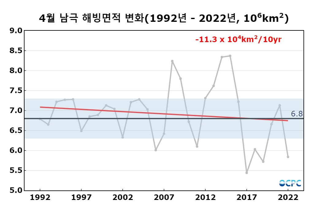 최근 30년 동안 4월 남극 해빙면적 변화 경향은 10년에 11.3만km² 정도로 감소 추세입니다.