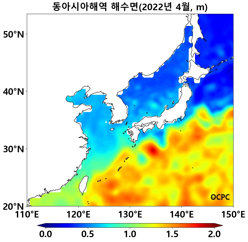 동아시아해역은 평년(16.2°C)보다 1.8°C 높았으며, 지난 30년(4월) 중 가장 높았습니다.
