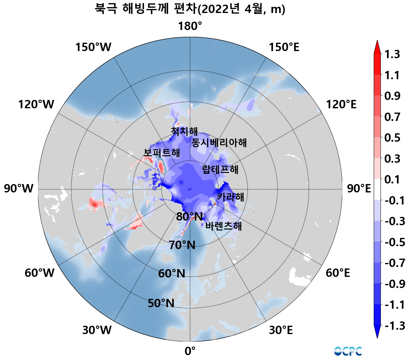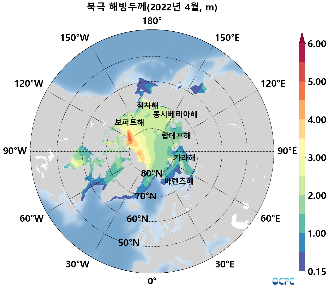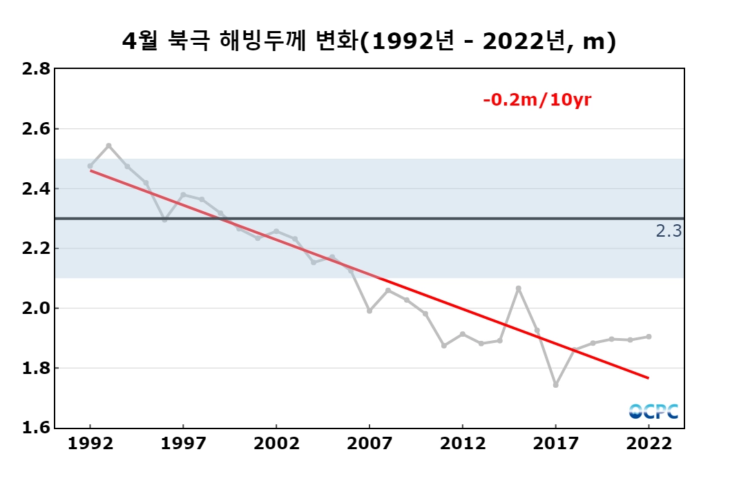 북극 해빙두께는 평년(약 2.3m)보다 약 0.4m(21%) 얇았으며, 최근 30년 동안 10년에 약 0.2m씩 얇아지는 추세입니다.