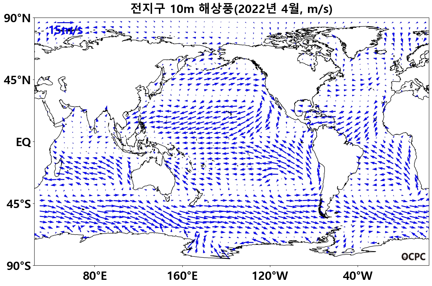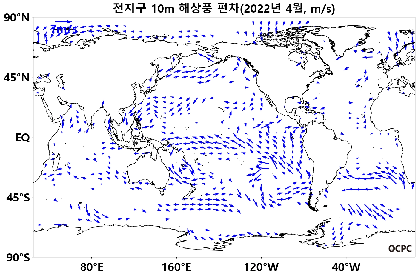 전지구 평균 해상풍속은 평년(4.4m/s)보다 0.3m/s(7.6%) 강했으며, 열대 중/서태평양의 무역풍이 평년보다 강했습니다.