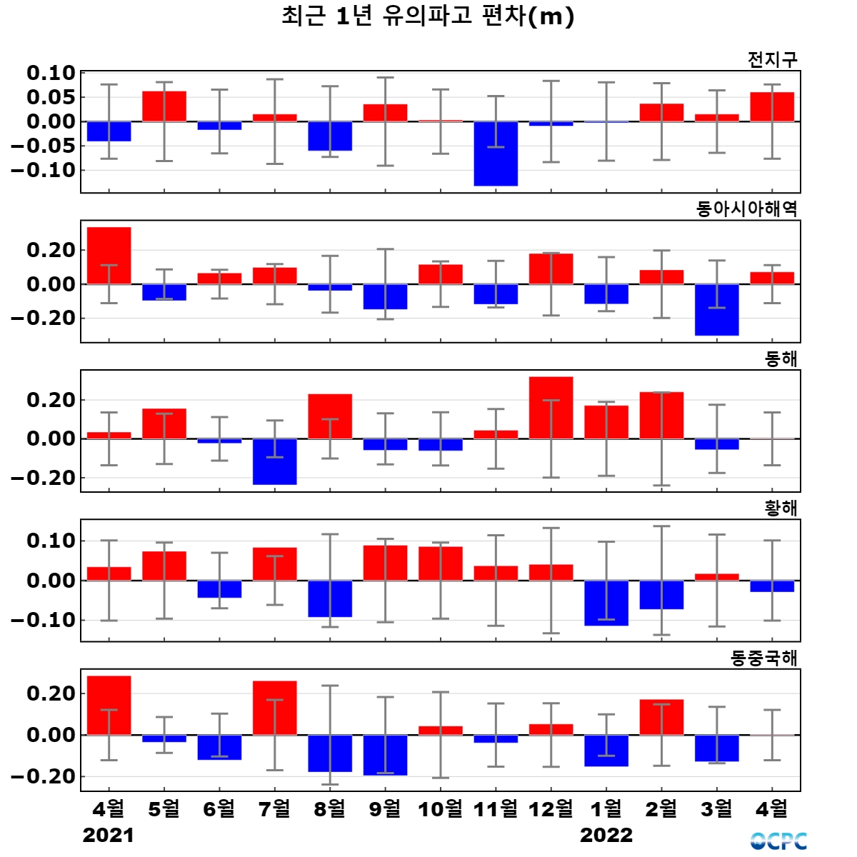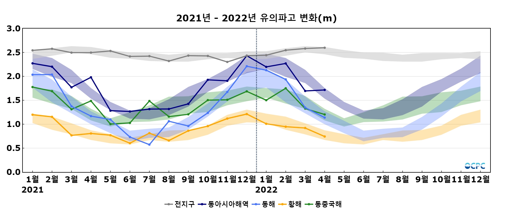 전지구 및 동아시아해역의 평균 유의파고는 평년(2.5m, 1.7m)과 비슷했습니다.