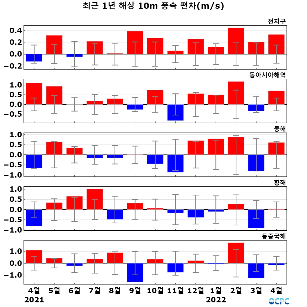 동해, 황해, 동중국해의 해상풍속은 평년(2.3m/s, 1.6m/s, 2.1m/s)과 비슷했습니다.