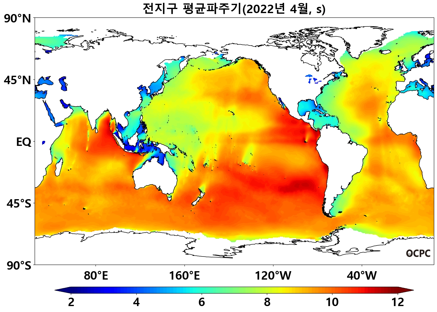 전지구 평균파주기는 평년(8.8초)과 비슷했으며, 동아시아해역은 평년(6.6초)보다 0.3초 길었습니다.