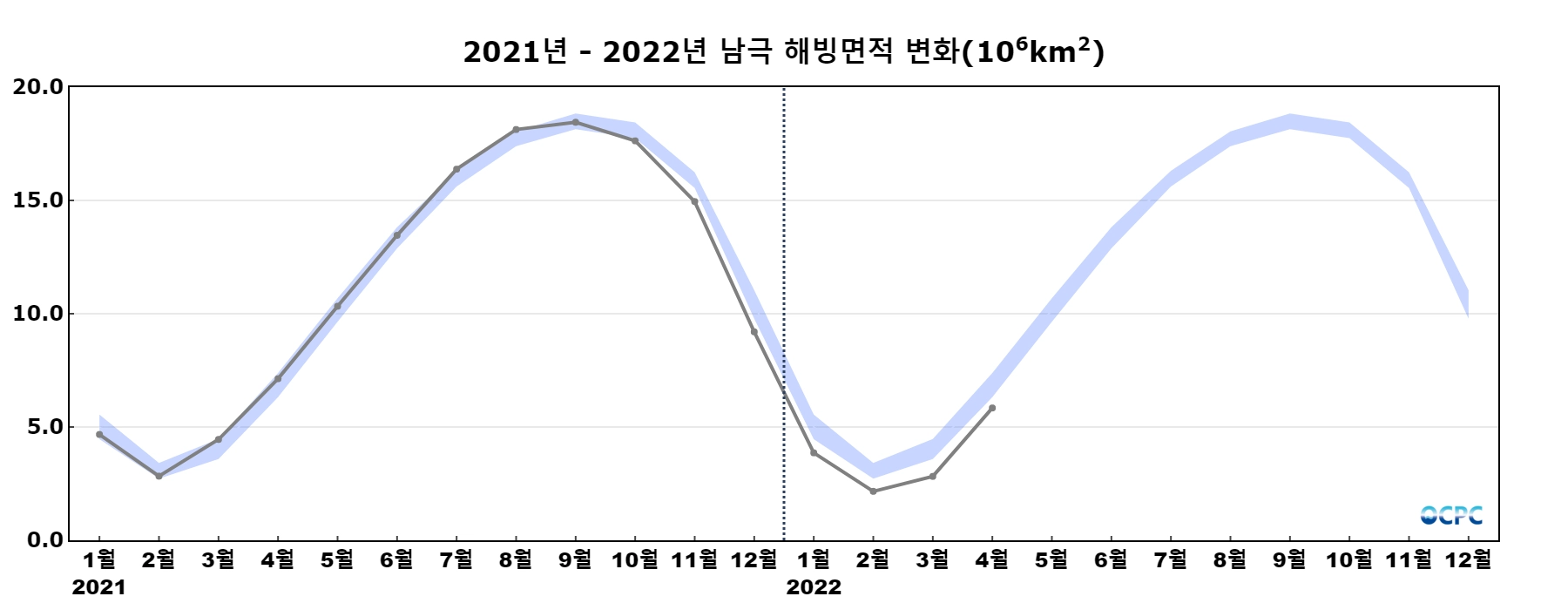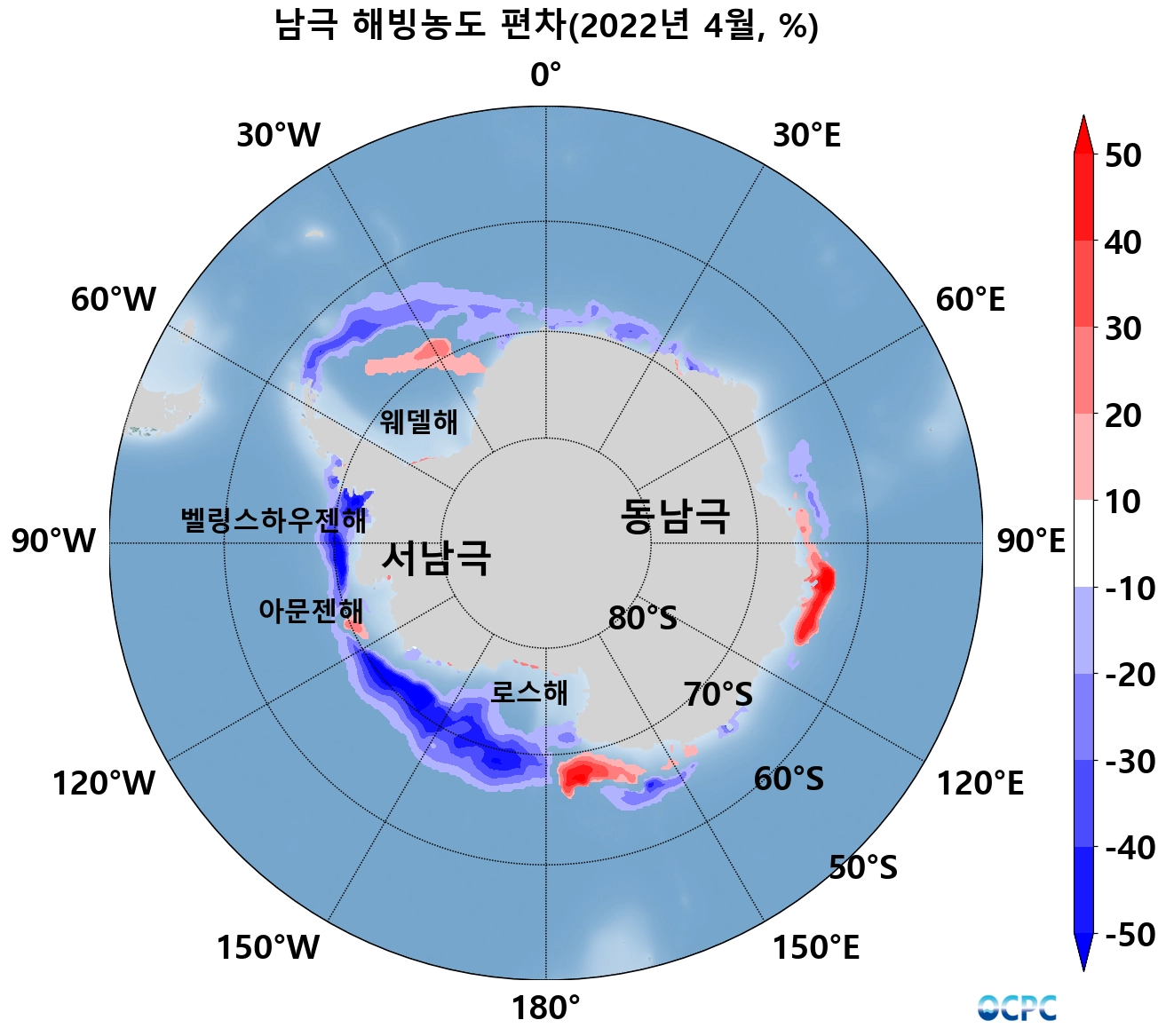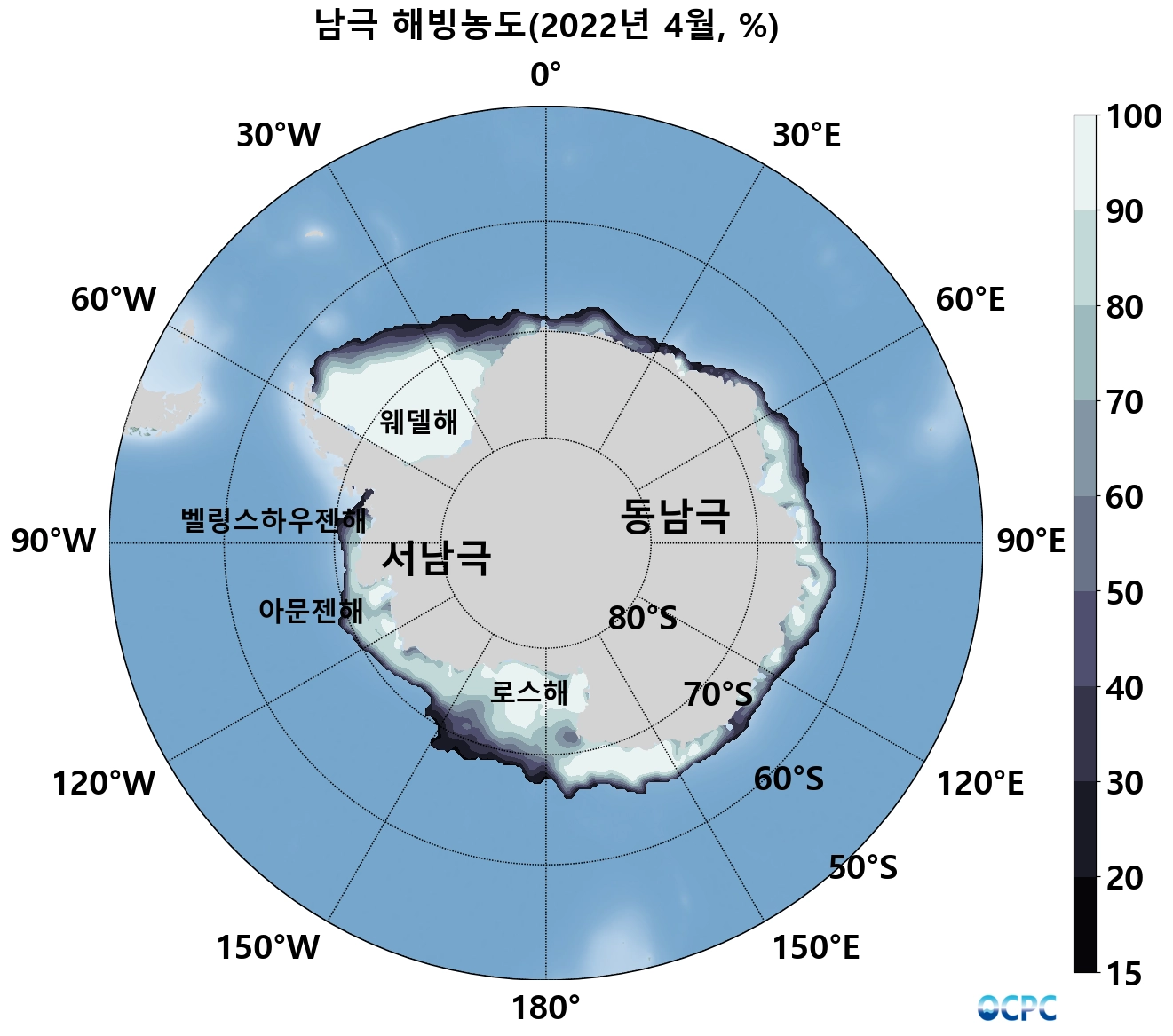 남극 해빙면적은 584만km²로 평년(685만km²)보다 101만km²(14.7%) 작았습니다.