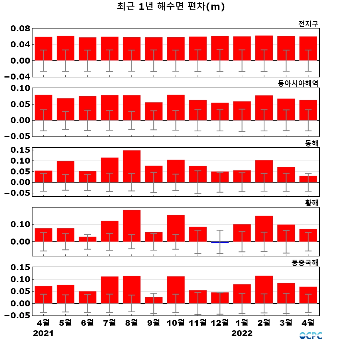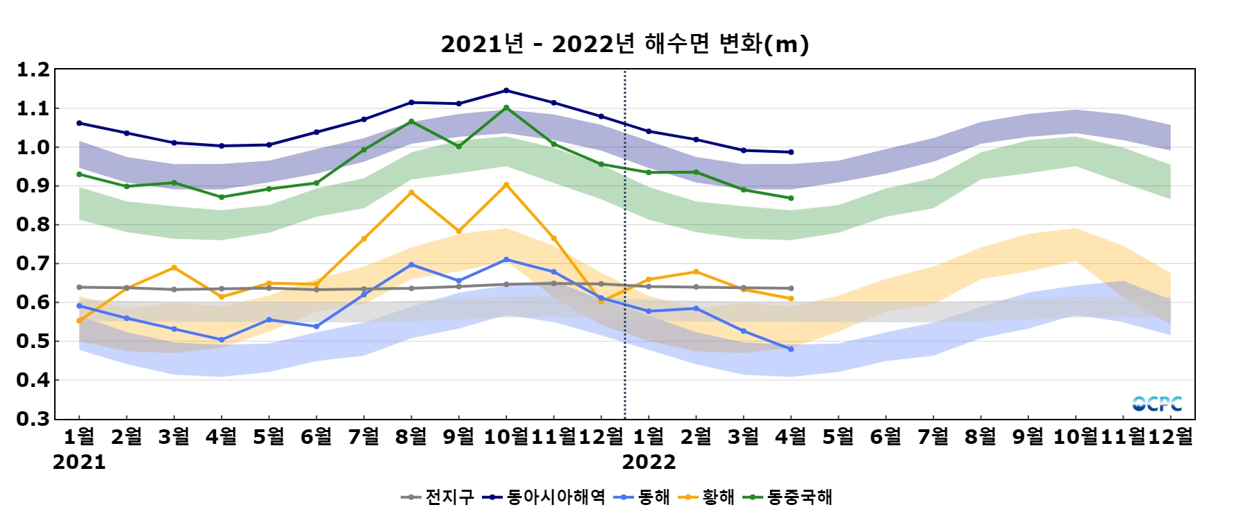 황해, 동중국해는 평년보다 각각 7.3cm, 7.0cm 높았고, 동해는 평년과 비슷했습니다.