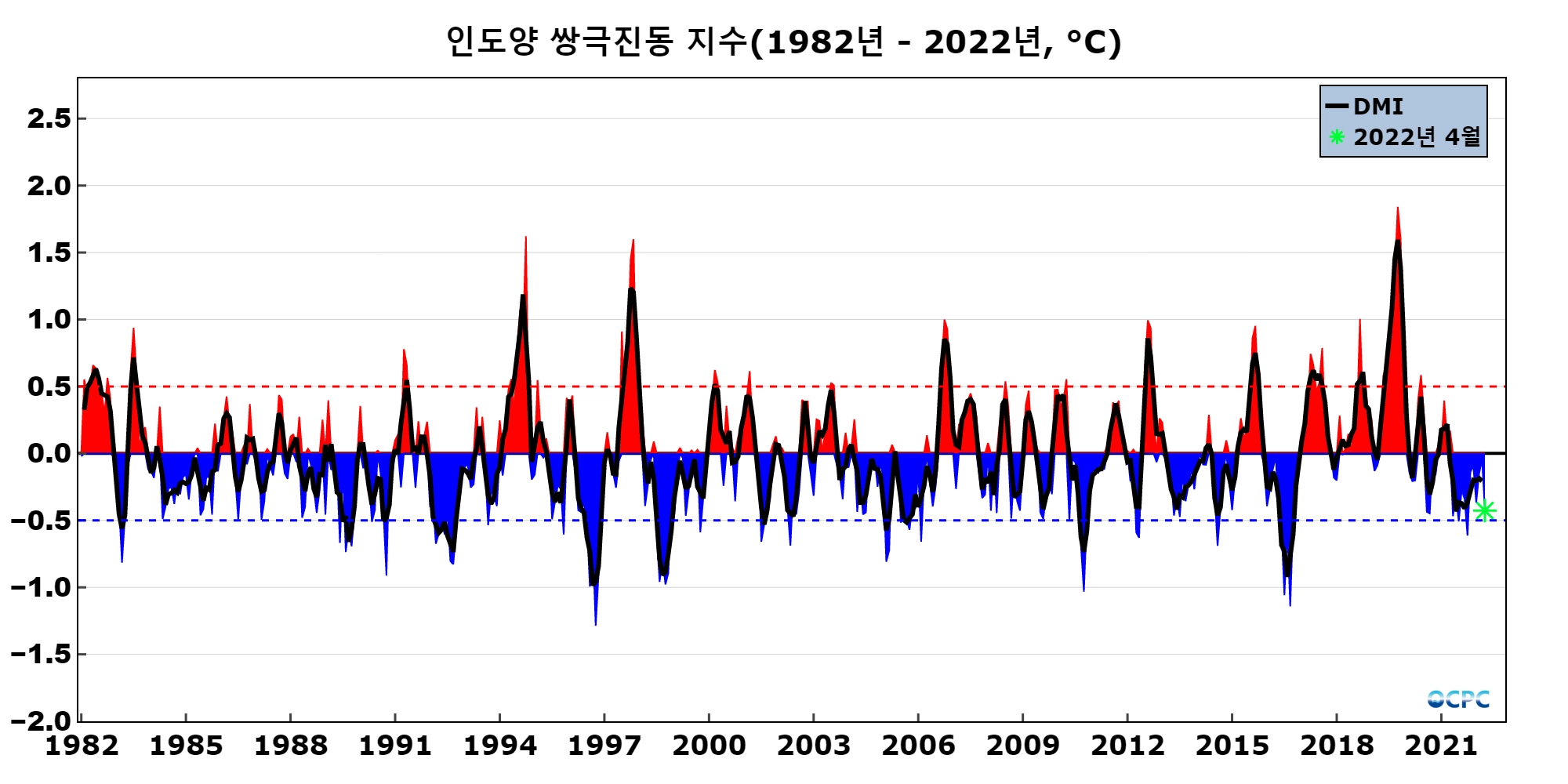 인도양 쌍극진동 지수 DMI (Dipole Mode Index)는 WTIO의 평년 대비 편차에서 SETIO 의 평년 대비 편차를 뺀 값으로 OCPC에서는 월 평균 지수(채색부분)를 3개월 이동평균하여 나타낸 지수(검정선)가 0.5보다 크면 양의 상태로, -0.5보다 작으면 음의 상태로 판정합니다.