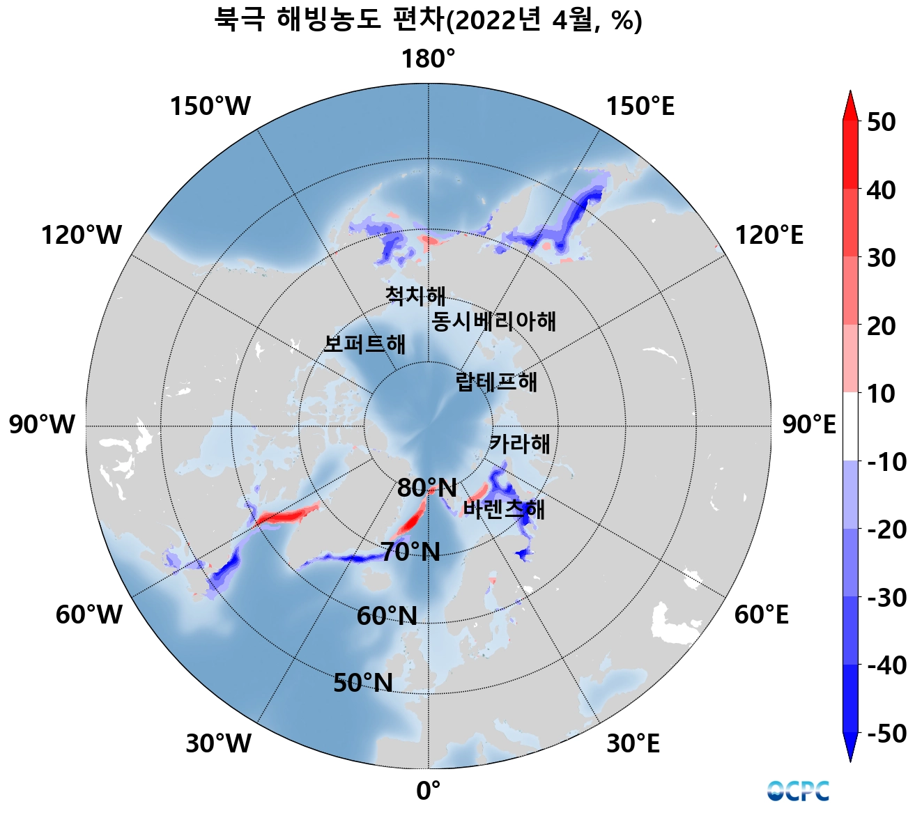 공간적으로는 오호츠크해 전역에서 평년대비 해빙면적 감소가 뚜렷하며, 베링해 동부, 북미 동안 뉴펀들랜드섬 주변, 그린란드해 남부, 그리고 바렌츠해에서도 감소했습니다.