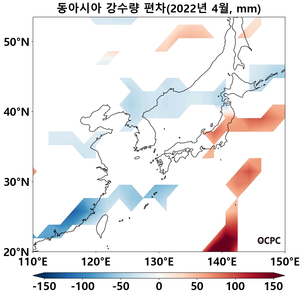 동해, 황해의 4월 해상강수량은 평년(49.2mm, 34.1mm)과 비슷했으며, 동중국해는 평년(77.5mm)보다 27.5mm(35.4%) 적었습니다.