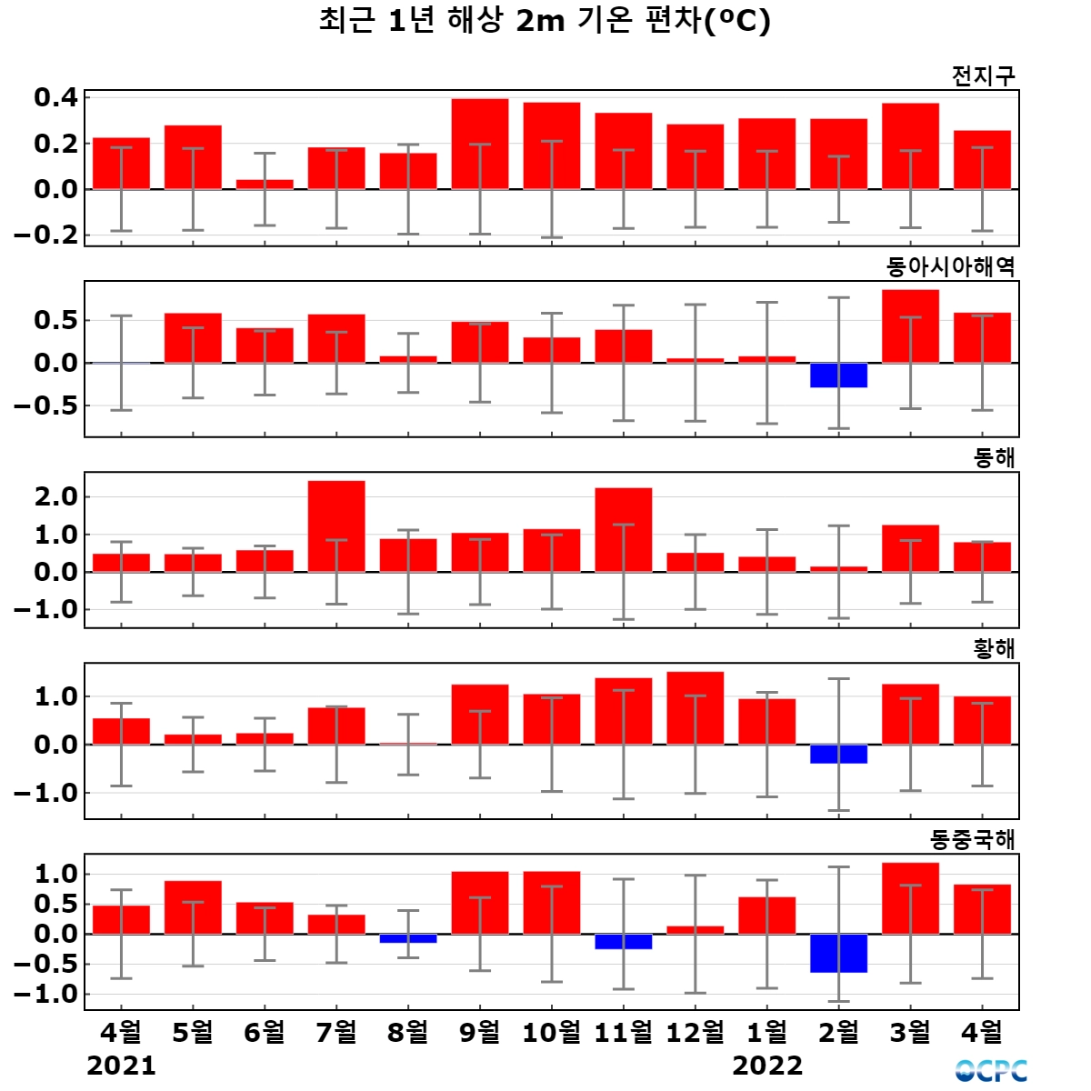 최근 30년 동안 전지구, 동해, 황해, 동중국해의 4월 해상기온은 10년에 0.1~0.2°C씩 증가하는 추세입니다.