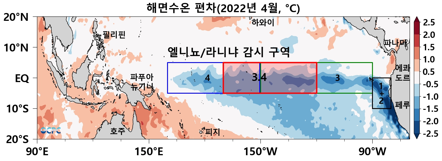 2022년 4월 평균 해면수온의 평년 대비 편차 (숫자가 표시된 사각형은 엘니뇨/라니냐 감시구역으로 각각 Nino1+2, Nino3, Nino4, Nino3.4 해역이며, ONI 지수는 Nino3.4 구역을 기준으로 합니다.)