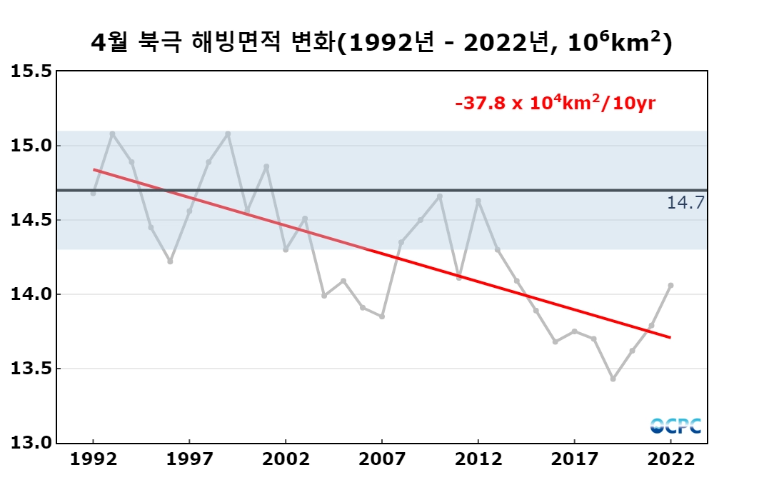 최근 30년 동안 4월 북극 해빙면적의 경향은 10년에 37.8만km² 정도의 감소 추세에 있습니다.