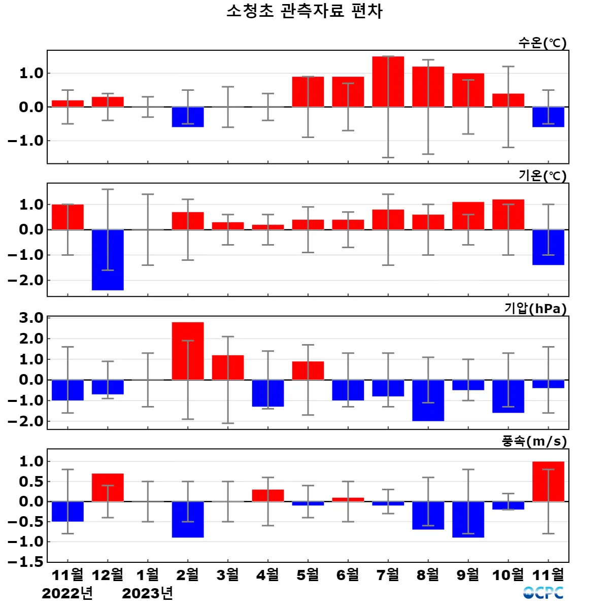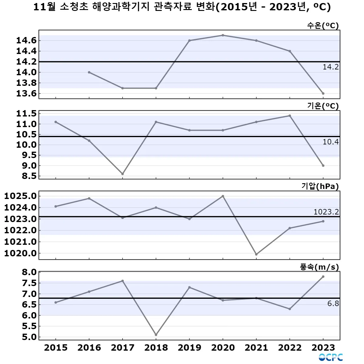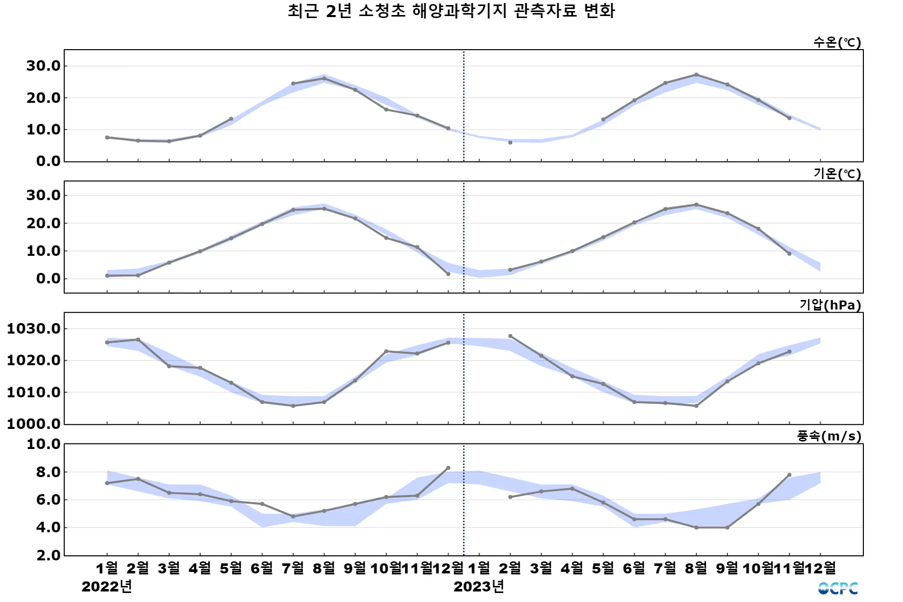 ※ 본 ‘해양과학기지 자료 분석 (2023년 11월)’은 분석은 ‘관할해역 첨단 해양과학기지 구축 및 융합연구’ 과제 및 국립해양조사원에서 제공하는 해양과학기지 관측자료를 사용하였음