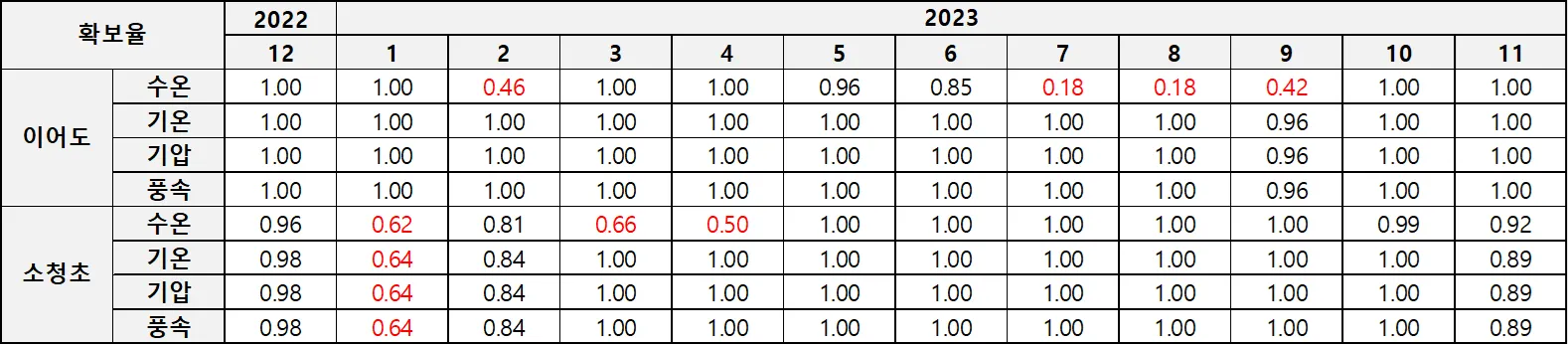 해양과학기지 관측자료 월별 확보율(2022-2023)