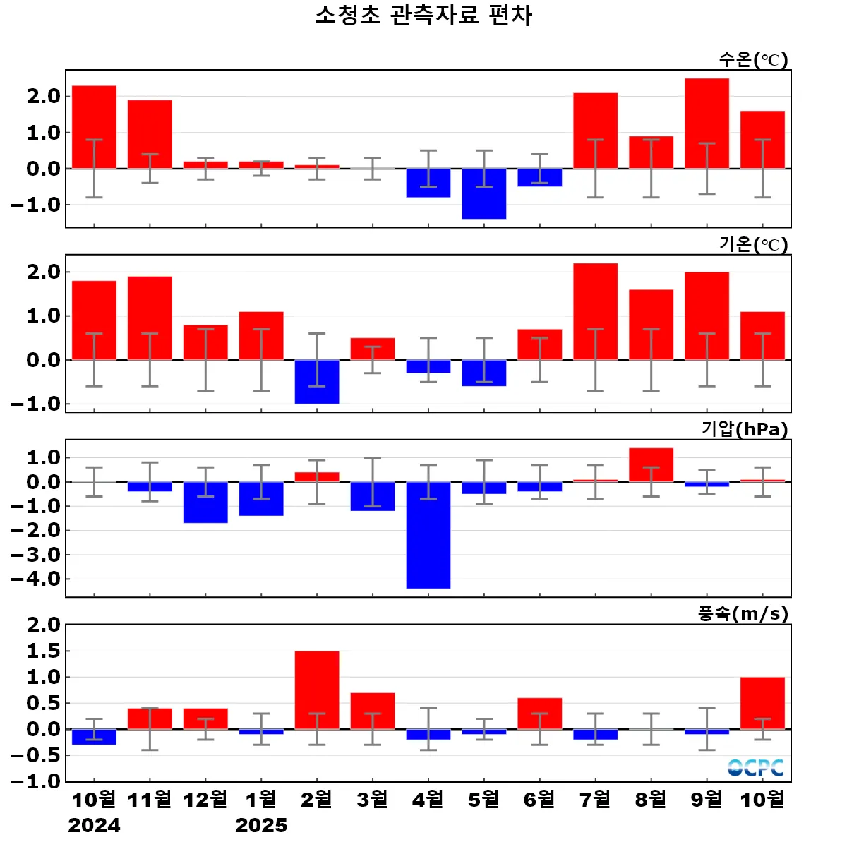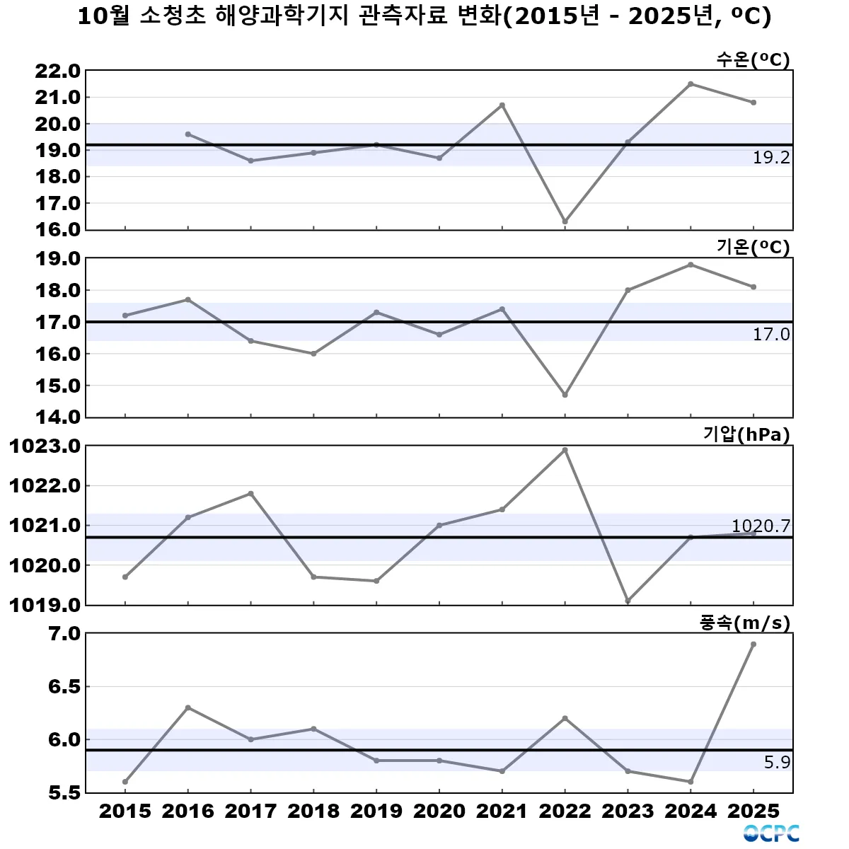 [수온] 소청초 기지 10월 수온(20.8℃)은 관측기간 평균(19.2±0.7℃)보다 1.6℃ 높았으며, 관측기간 10월 평균 수온 중에서 두 번째로 높은 값을 기록하였습니다(상위 1위: 2024년 21.5℃).