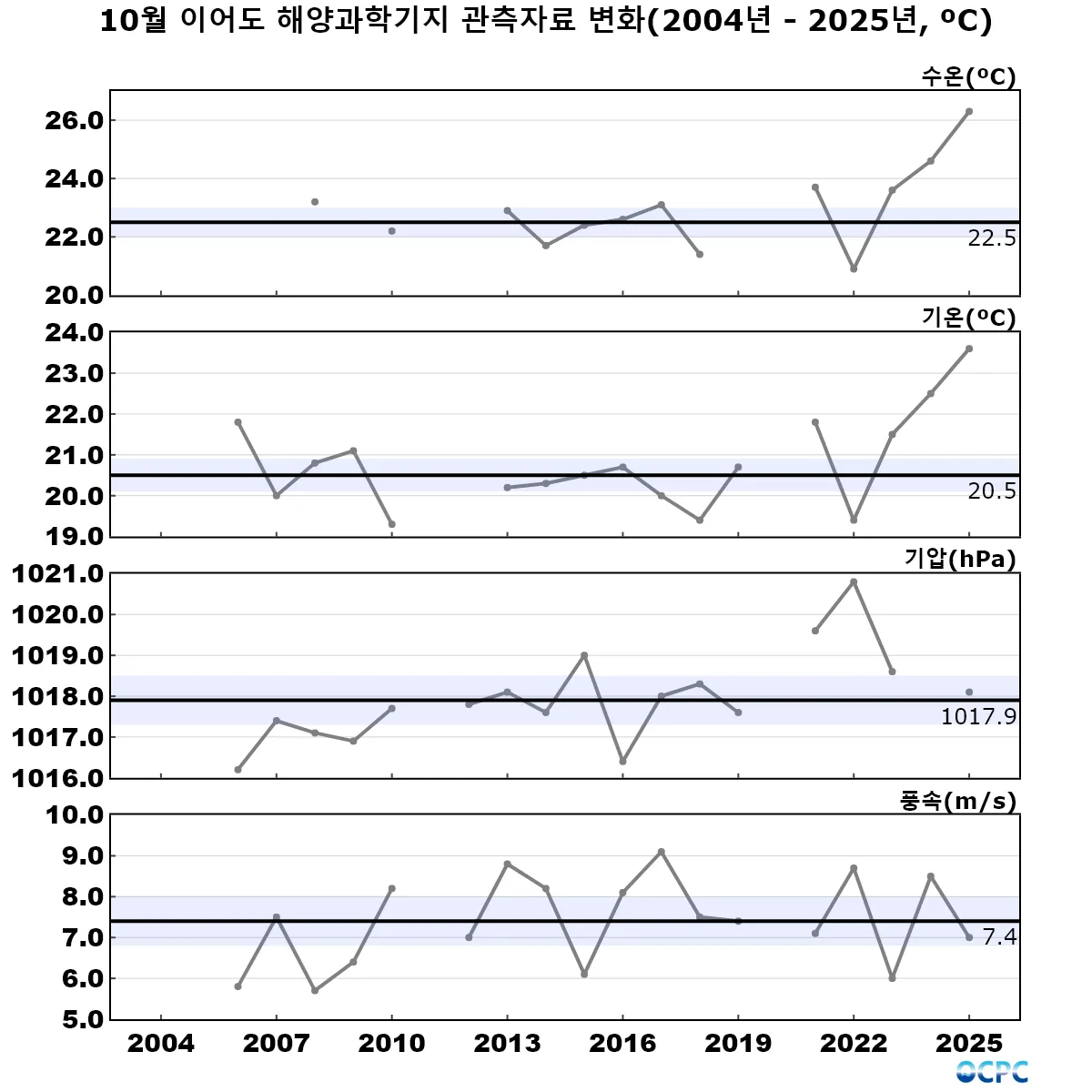 [수온] 이어도 기지 10월 수온(26.3℃)은 관측기간 평균(22.5±0.5℃)보다 3.8℃ 높았습니다. 이는 관측기간 10월 평균 기온 중에서 가장 높은 값이며, 관측기간 내에서 두번째로 높은 수온 편차입니다(상위 1위: 2025년 9월, 3.9℃).