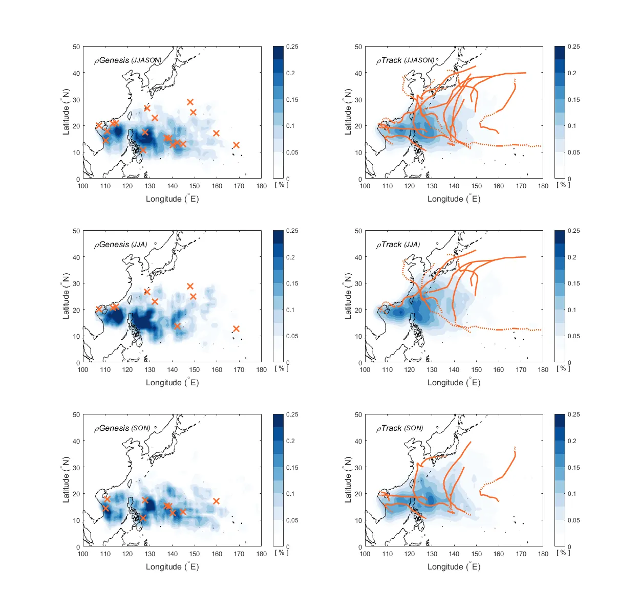 2021년 북서태평양에서 발생한 태풍의 발생위치 (좌; 주황색 X표시) 및 진로 (우; 주황색 실선, 점선은 TD등급을 의미) . 음영은 기후평균 발생밀도 (좌) 및 진로밀도 (우)를 의미. JJA기간 태풍은 필리핀해와 남중국해의 높은 발생밀도를 보이는 위치에서는 발생하지 않았으며 주로 북쪽으로 편향됨. 진로 역시 JJA기간에는 필리핀해 및 남중국해에서 활동이 적었음.