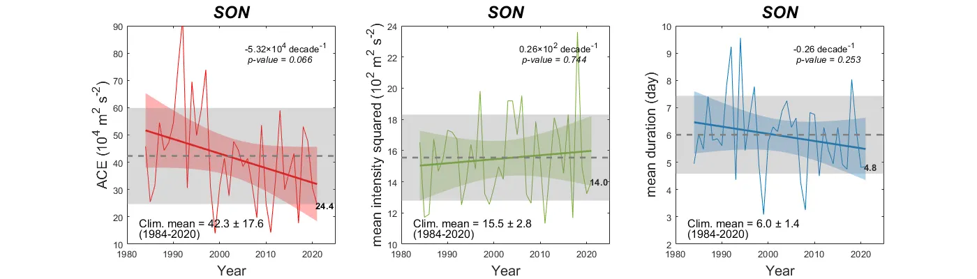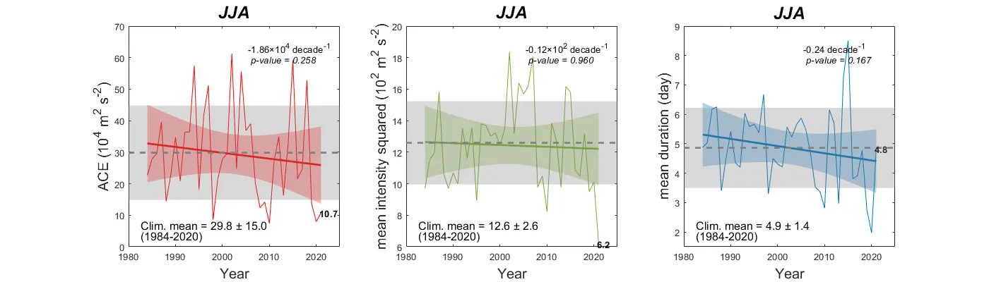 북서태평양 폭풍 누적 에너지 (좌, Accumulated Cyclone Energy; ACE), 평균 강도 제곱 (중간), 태풍 지속시간 (우)의 시계열. 색상이 있는 음영은 선형추세선 (진한 실선)의 95% two-sided confidence intervals을 나타냄. 회색 파선은 평균값을, 회색 음영은 평균에서 ±1 표준편차 범위를 의미함. 추세 검정은 Mann-Kendall Tau non-parametric function을 사용함. 2021년 ACE는 분석기간 내 4번째로 낮은 값을 나타냄. 특히 평균 강도 제곱은 분석기간 중 가장 낮은 수치를 나타냈으며 이는 JJA기간의 강한 강도의 태풍의 부재에 따른 것으로 생각됨.