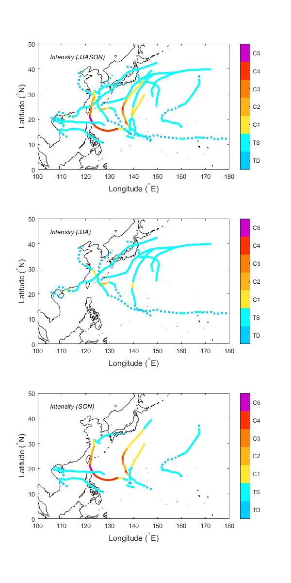 JJA기간 Cat. 3이상 강도(최대풍속 50m/s이상)를 보이는 태풍이 발생하지 않은 건 분석기간 내에 처음 (분석기간 이전 1981년에도 0개 기록)