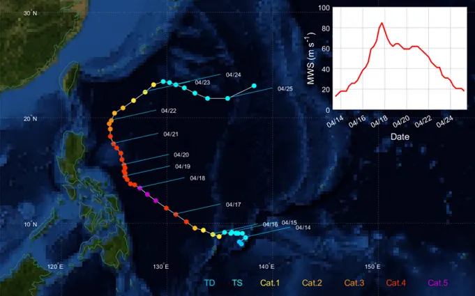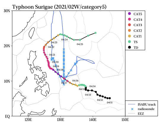 4월 발생 태풍 중 역대 가장 강한 태풍인 수리개는 한국해양과학기술원의 관측선인 이사부호가 해양-대기 관측을 위해 출항한 기간(2021년 4/6-5/4) 동안 필리핀 앞바다에서 발생과 소멸을 하였으며 이사부호에서는 수리개 통과 전후 라디오존데와 CTD 관측을 통해 대기와 해양의 연직 프로파일을 획득하였다. 특히 4월 14일에 발생한 수리개는 급강화를 거쳐 17일 이후 강도 5등급의 태풍으로 발달하였으며 4월 발생 태풍으로 2021년 가장 강한 태풍으로 기록되는 등 북서태평양지역 태풍 급강화 기작을 밝히는 연구에 매우 중요한 사례로 활용될 전망이다.