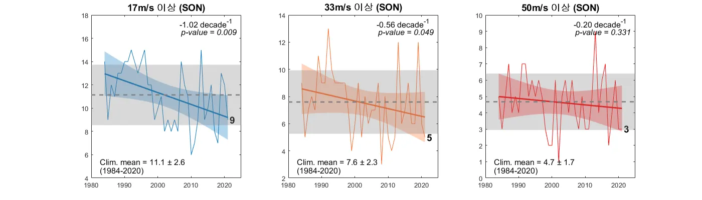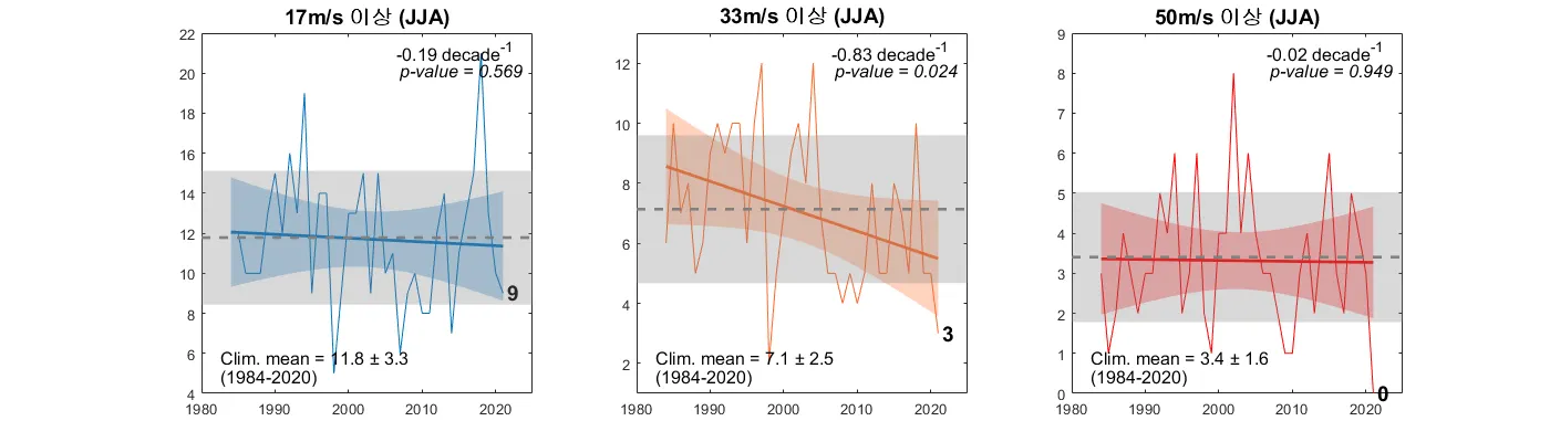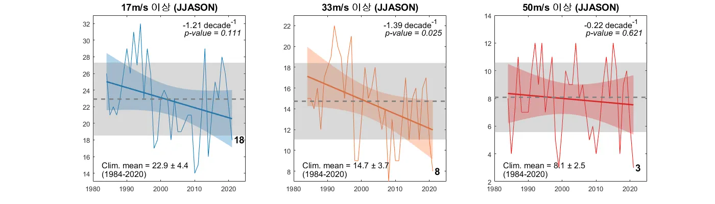 2021년 북서태평양 태풍 강도 별 발생 빈도. 색상이 있는 음영은 선형추세선 (진한 실선)의 95% two-sided confidence intervals을 나타냄. 회색 파선은 평균값을, 회색 음영은 평균에서 ±1 표준편차 범위를 의미함. 추세 검정은 Mann-Kendall Tau non-parametric function을 사용함. JJASON기간 발생한 총 18개의 태풍 중 Cat.1 (33m/s이상 강도)이상의 강도를 보이는 태풍은 총 8개로 비율이 상당히 낮았음. 특히 JJA기간에 이러한 특징이 두드러지게 나타났으며 이 기간 Cat. 3 (50m/s이상 강도)이상의 태풍은 발생하지 않았음. 발생빈도 추세를 살펴보면 TS등급 (17m/s이상 강도) 이상의 태풍 빈도가 SON기간에서 유의한 감소 추세를 보였으며 Cat. 1이상 강도의 태풍들은 전 기간 유의한 감소 추세를 나타냄.