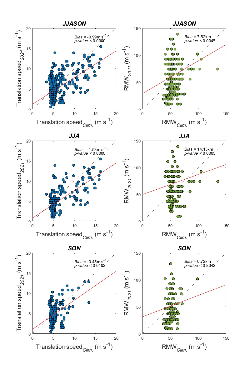 2021년 북서태평양 태풍 이동속도 (좌) 및 최대풍속반경 (우)과 기후 평균 과의 산포도. 통계적 유의성 평가는 대응표본 t-검정을 사용. 태풍 위치의 기후평균과 실제 태풍의 값을 비교.