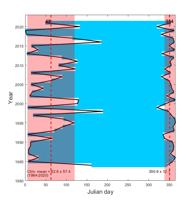 북서태평양 태풍 발생 시작일 및 태풍 활동 종료일 시계열. 빨간색 파선은 평균을, 분홍색 음영은 표준편차 범위를 의미함. 2021년 첫 태풍은 49 Julian day (JD)에 발생했으며 마지막 태풍은 354JD에 소멸했음.