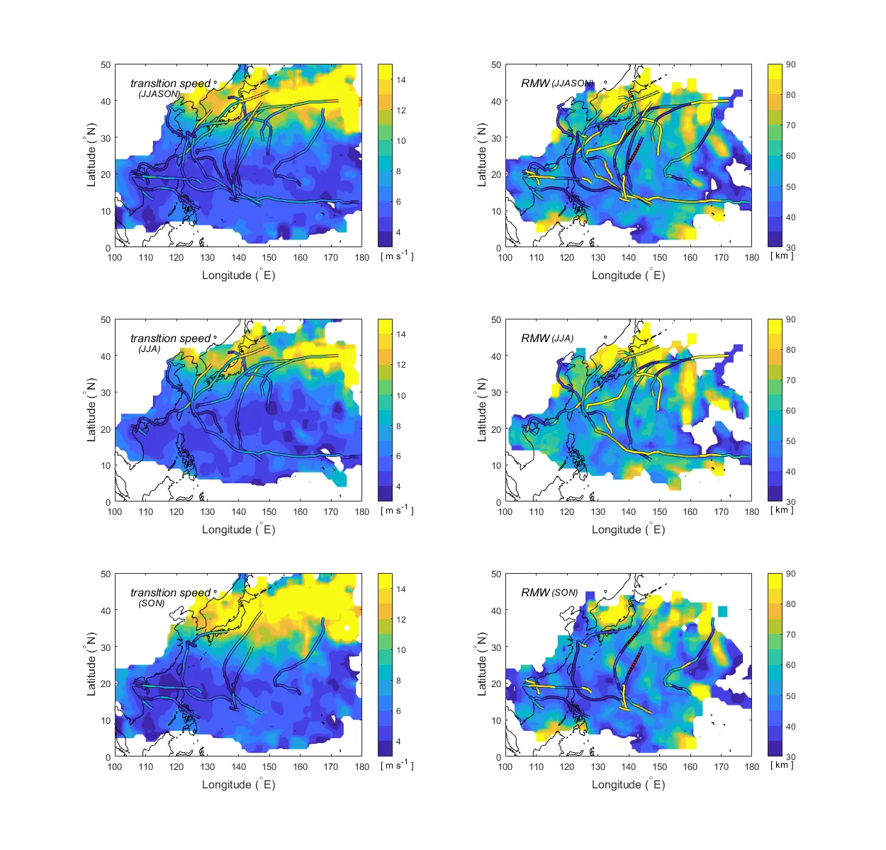 2021년 북서태평양 태풍 이동속도 (좌; 실선에 색으로 표기) 및 최대풍속반경 (우; 실선에 색으로 표기). 음영은 기후평균 이동속도 (좌) 및 최대풍속반경 (우)을 의미.