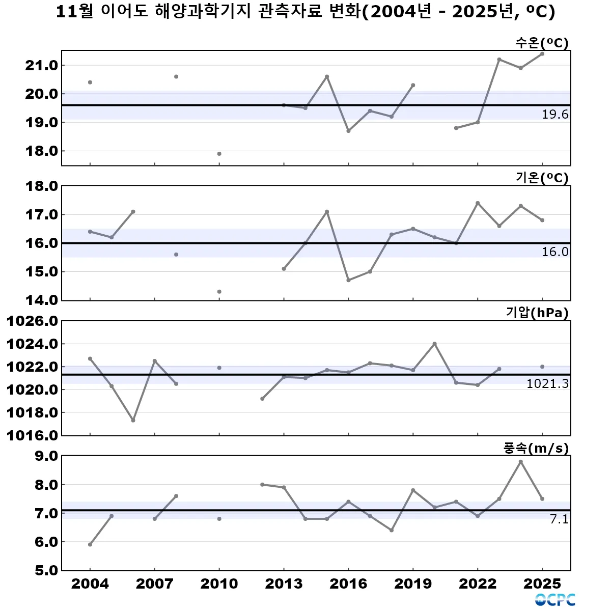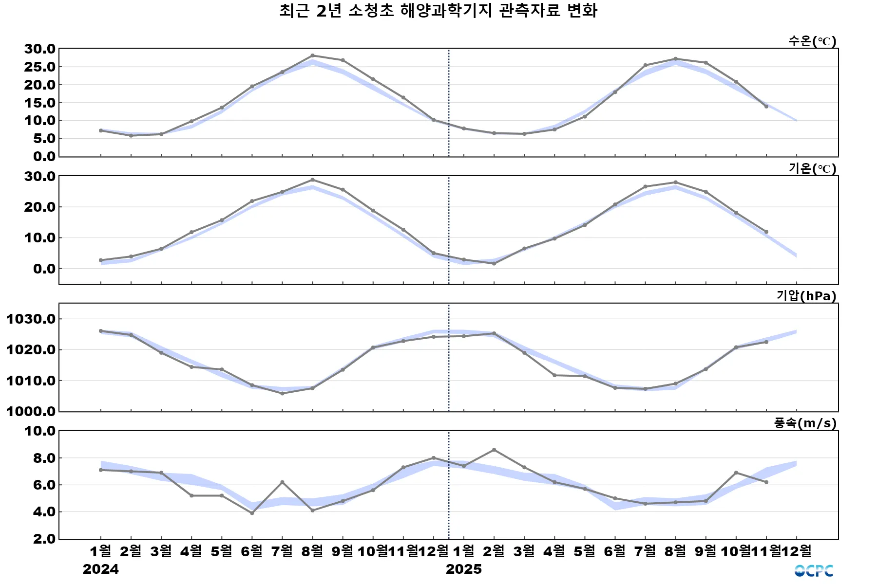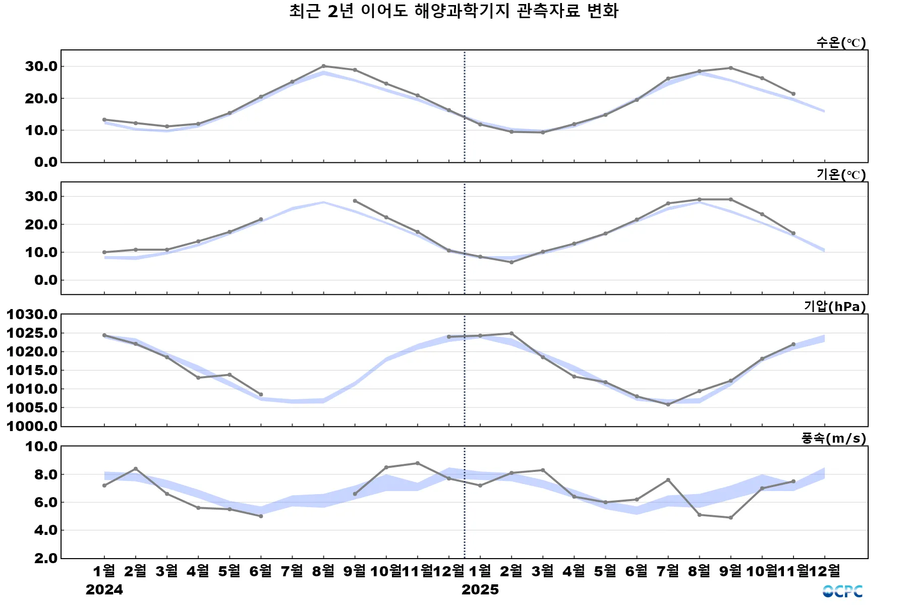 ※ 본 ‘해양과학기지 자료 분석 (2025년 11월)’은 분석은 ‘관할해역 첨단 해양과학기지 구축 및 융합연구’ 과제 및 국립해양조사원에서 제공하는 해양과학기지 관측자료를 사용하였음