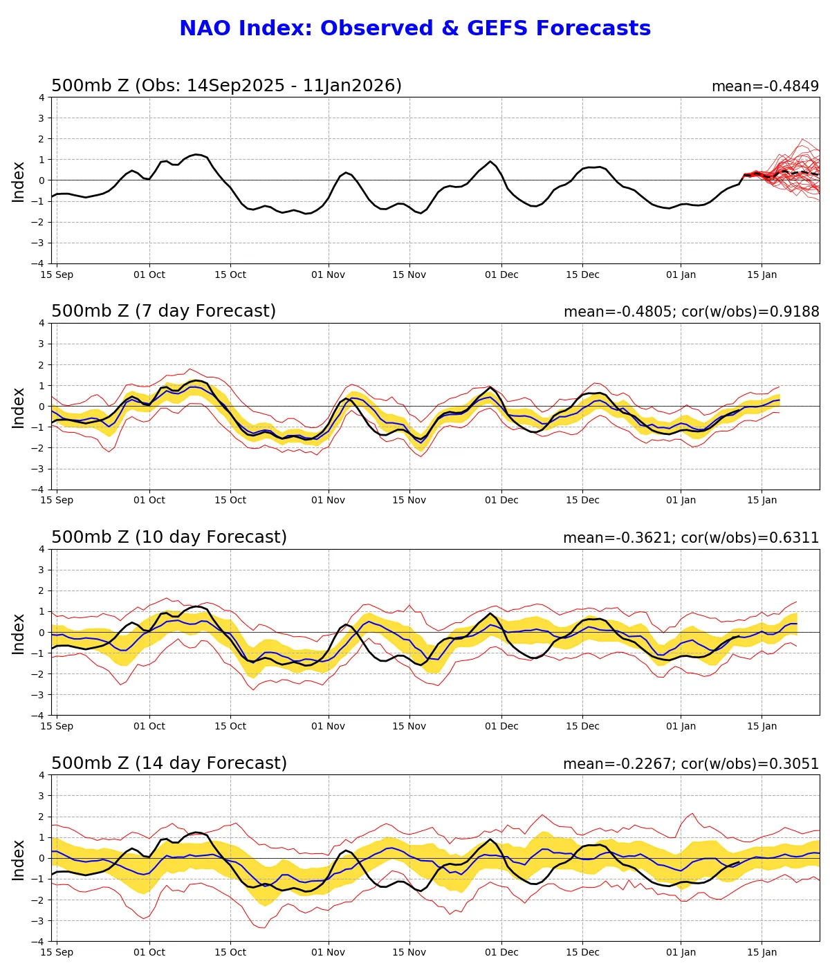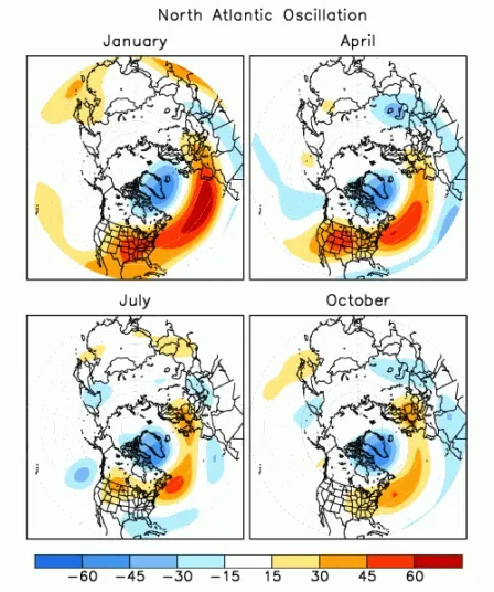 북대서양 진동(NAO) 지수는 아열대 고기압(아조레스 고기압)과 아극(Subpolar) 저기압 사이의 해기차로 나타냅니다. NAO의 두 위상 모두 북대서양 제트기류와 폭풍 경로의 강도 및 위치 변화, 그리고 동서 및 남북 방향의 열과 수분 수송 패턴의 대규모 변동과 관련이 있으며, 북미 동부부터 서유럽 및 중부 유럽에 이르는 광범위한 지역의 기온 및 강수 패턴 변화를 초래합니다.