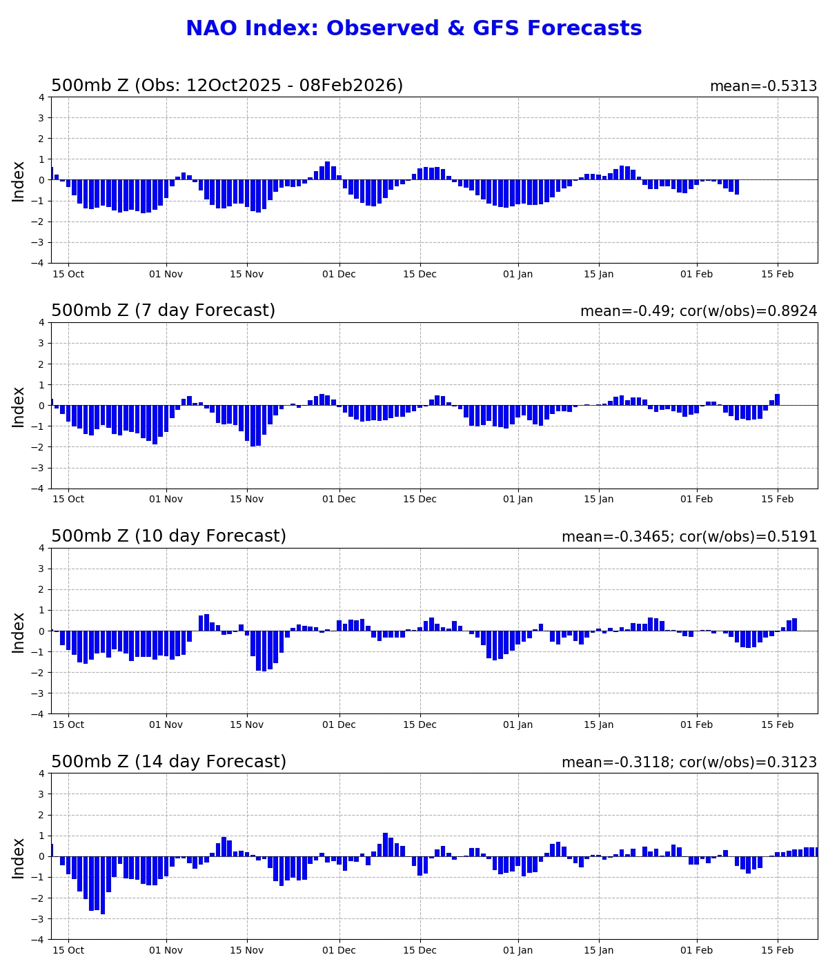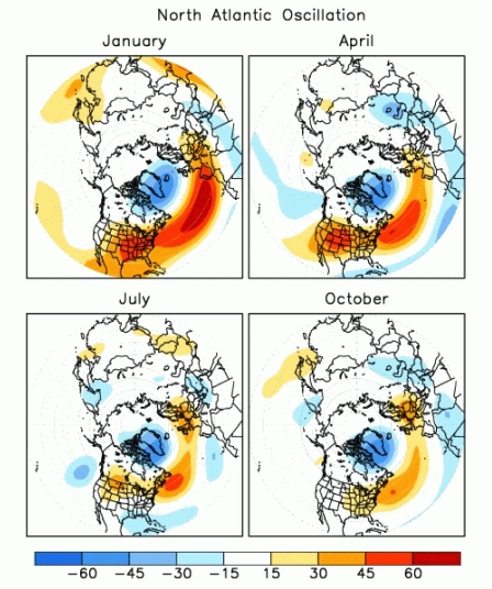북대서양 진동(NAO) 지수는 아열대 고기압(아조레스 고기압)과 아극(Subpolar) 저기압 사이의 해기차로 나타냅니다. NAO의 두 위상 모두 북대서양 제트기류와 폭풍 경로의 강도 및 위치 변화, 그리고 동서 및 남북 방향의 열과 수분 수송 패턴의 대규모 변동과 관련이 있으며, 북미 동부부터 서유럽 및 중부 유럽에 이르는 광범위한 지역의 기온 및 강수 패턴 변화를 초래합니다.