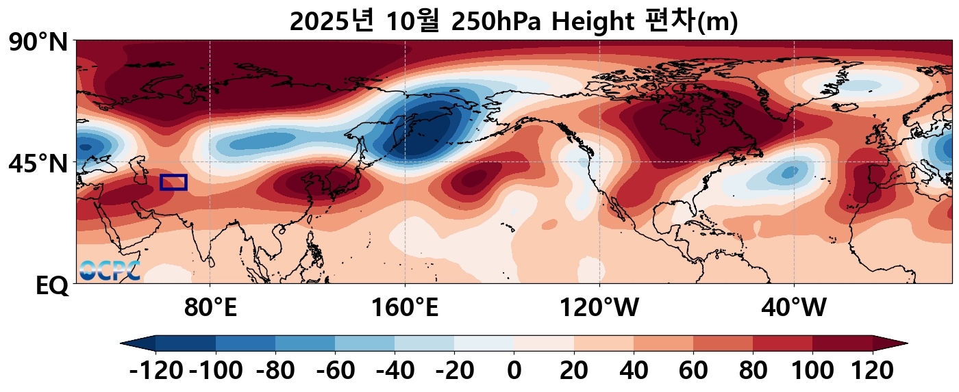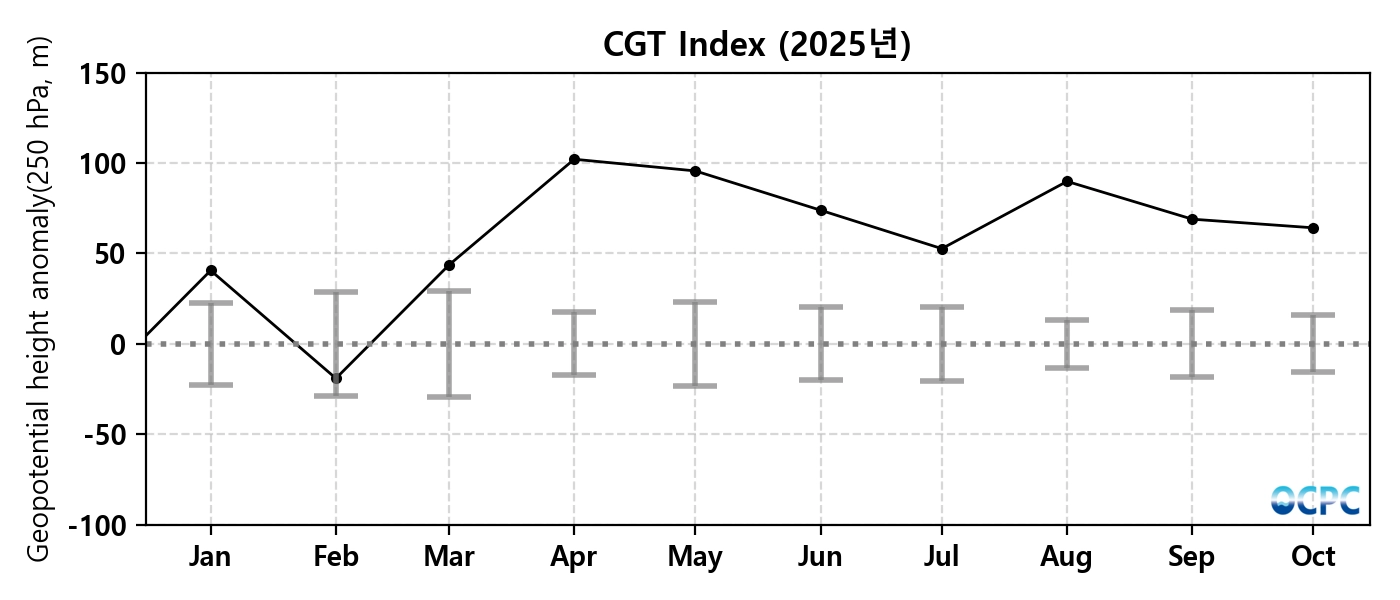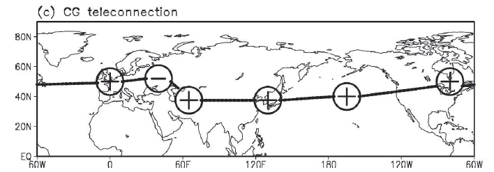 북반구 중위도 여름철 상층 대기에서는, 서에서 동으로 이어지는 정체된 파동 형태의 순환 패턴이 나타나는데, 이를 Circumglobal Teleconnection(CGT)이라 합니다. 이 패턴은 상층 지위고도 편차장에서 뚜렷하게 나타나며, 서중앙아시아에서 시작된 로스비파가 동아시아, 북태평양을 지나 북미에 이르기까지 파동 구조를 이루는 것이 특징입니다. CGT는 여름철 동아시아 지역의 고온, 강수, 몬순 강도 등에 영향을 주는 주요한 원격상관계(Teleconnection) 메커니즘 중 하나로 알려져 있습니다. CGT Index는 논문에 따라 서중앙아시아(35°–40°N, 60°–70°E)의 상층 해면고도 편차 평균으로 구해집니다.