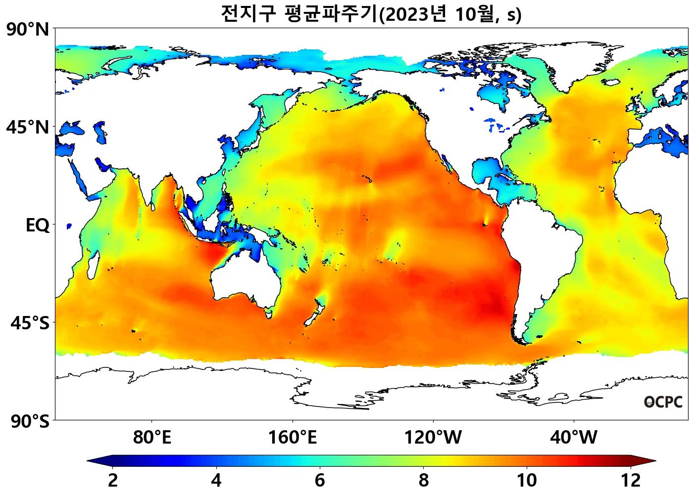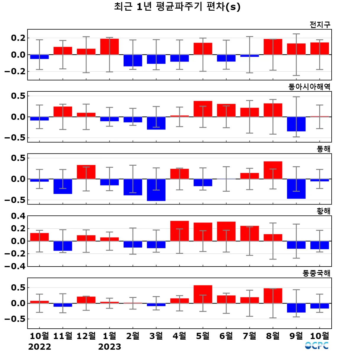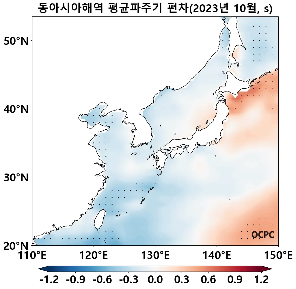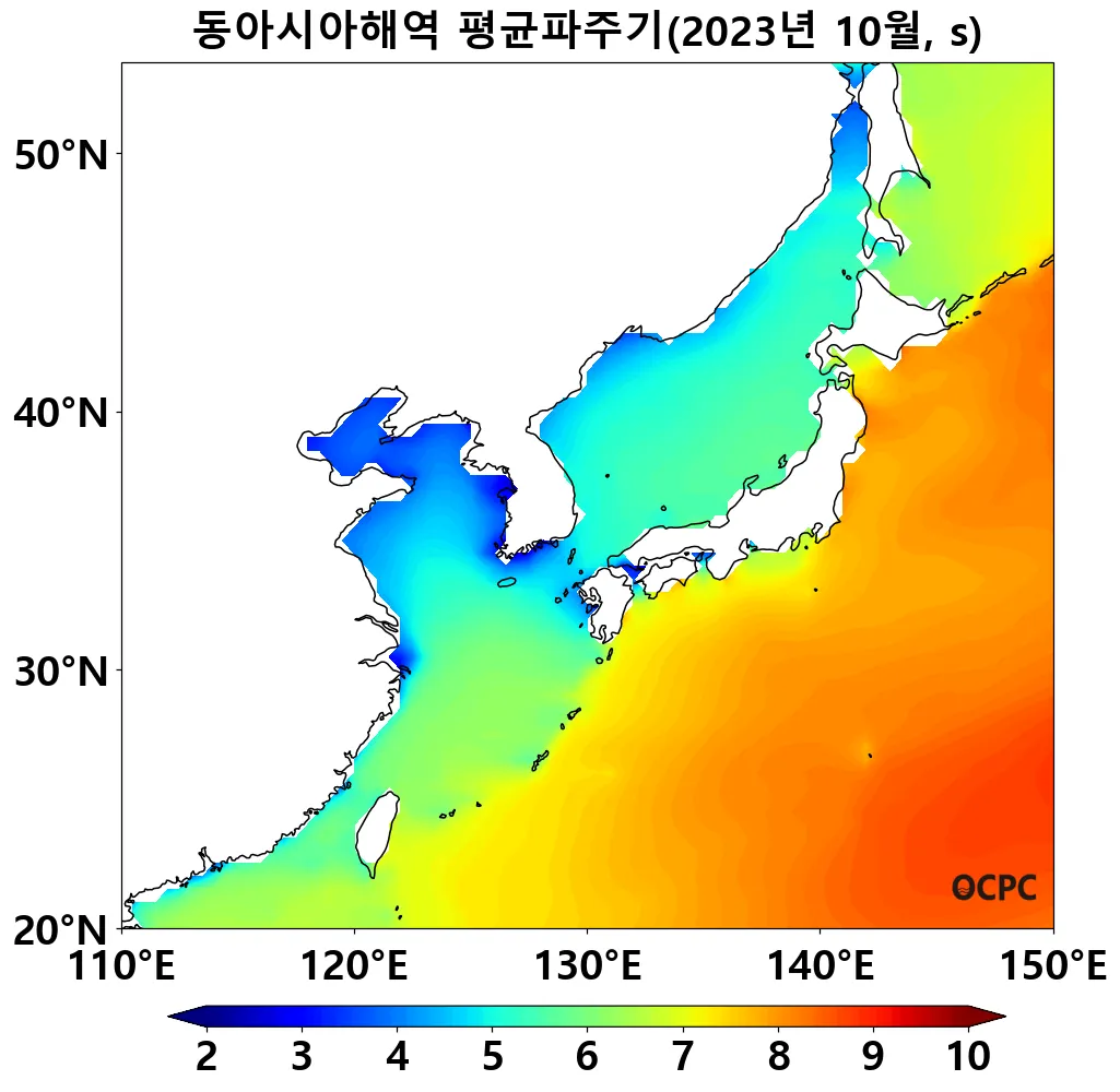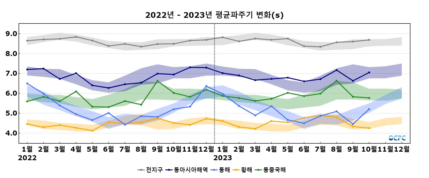 동해, 황해, 동중국해의 평균파주기는 평년(5.3±0.2초, 4.4±0.2초, 5.9±0.3초)과 비슷했습니다.