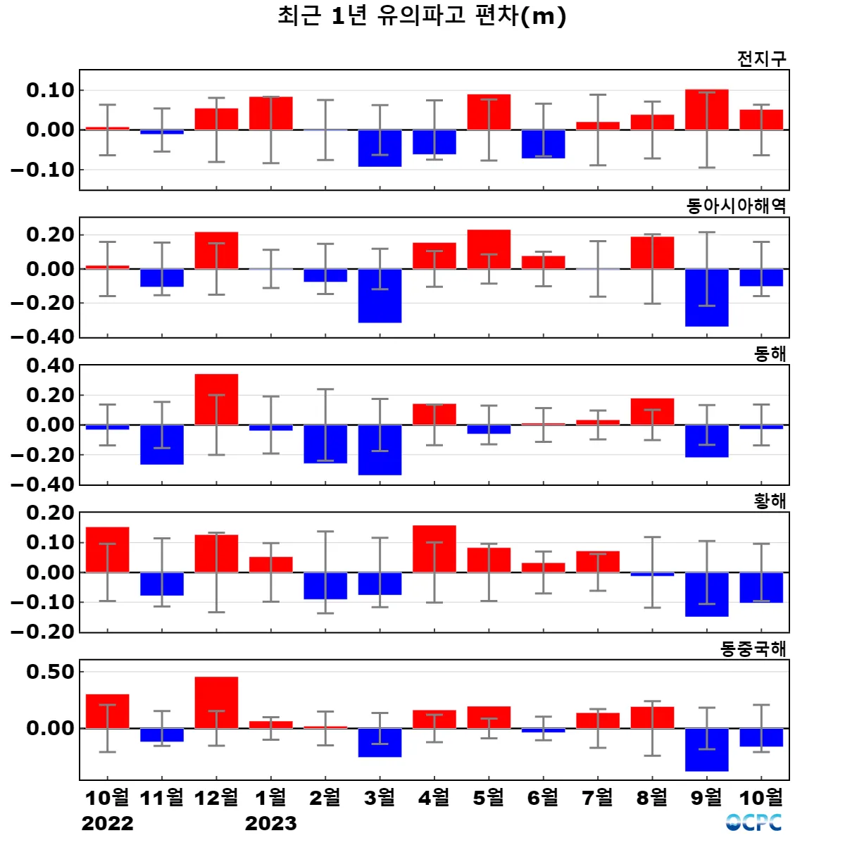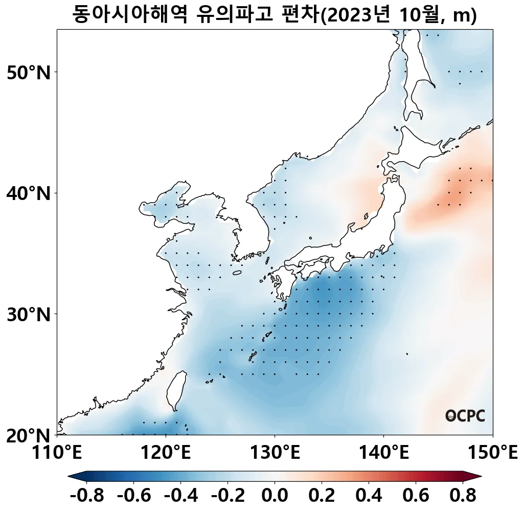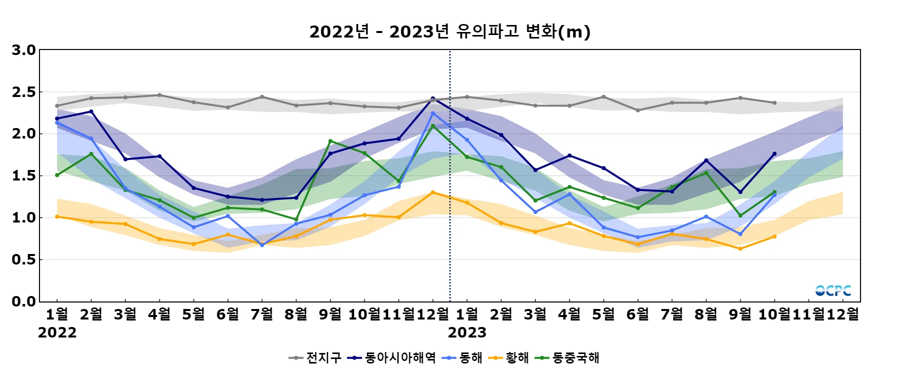 황해의 평균 유의파고는 평년(0.9±0.1m)보다 0.1m 감소했으며, 동해, 동중국해는 평년(1.3±0.1m, 1.5±0.2m)과 비슷했습니다.