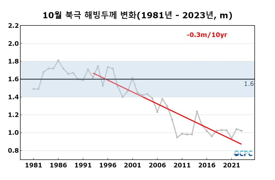 10월 북극 해빙두께는 1.0m로 평년(1.6±0.2m) 보다 약 0.6m(35.9%) 감소했으며, 1993~2023년 동안 10년에 0.3m씩 감소하는 추세입니다.