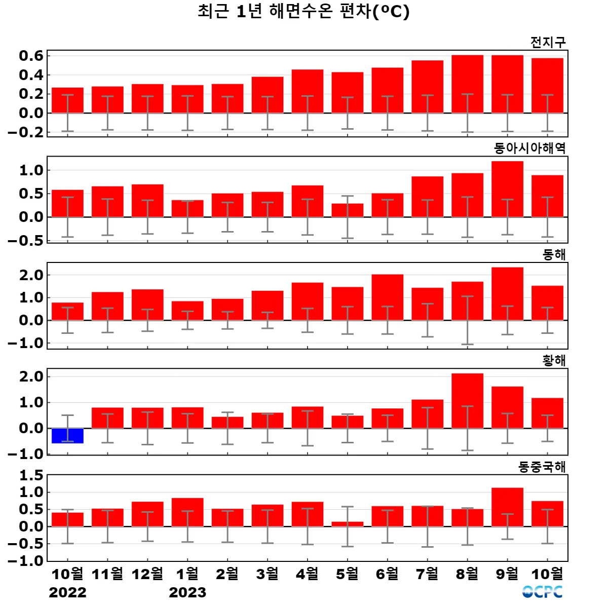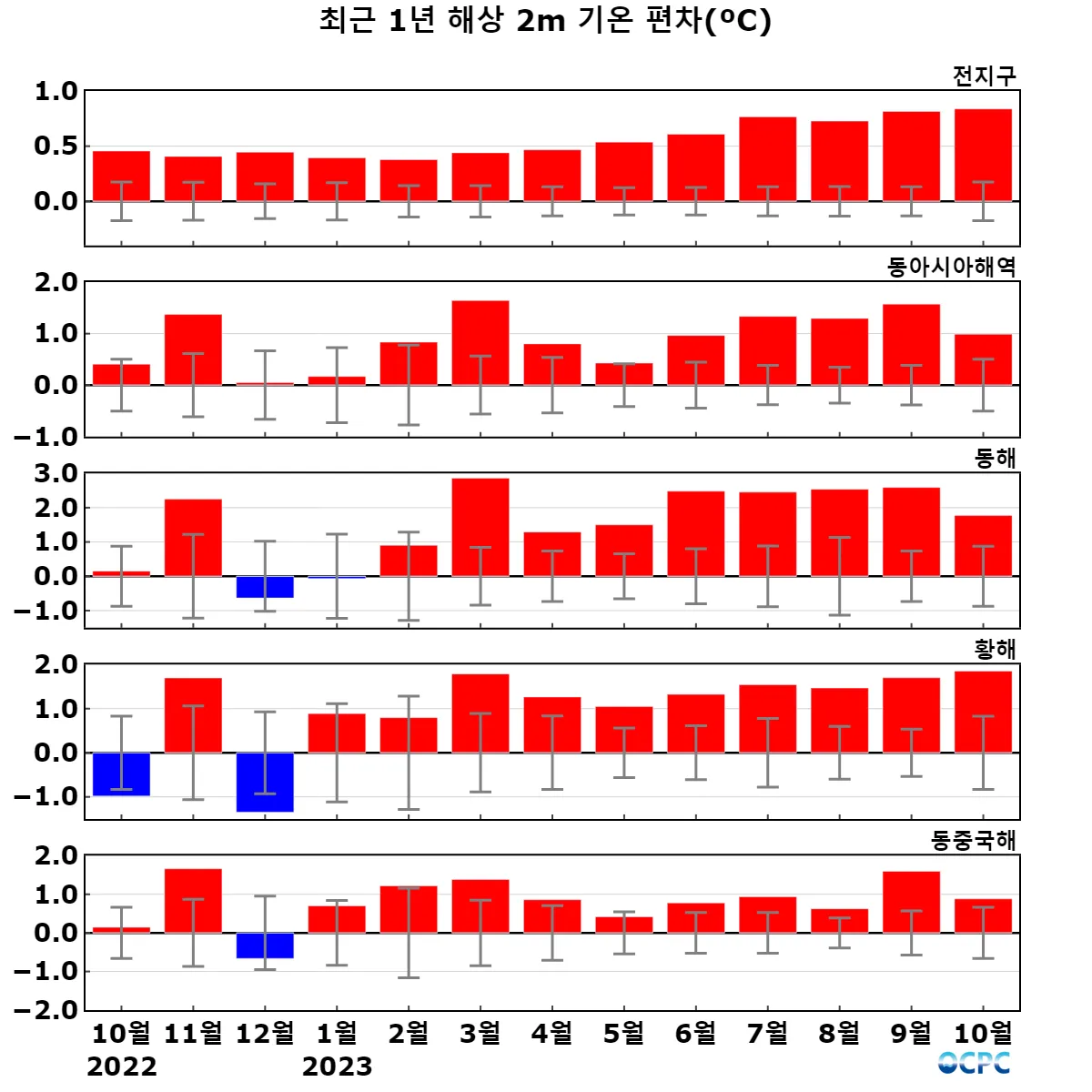 동해, 황해, 동중국해의 해상기온은 평년(14.2±0.9°C, 17.3±0.8°C, 22.5±0.7°C)보다 각각 1.8°C, 1.9°C, 0.9°C 높았습니다.