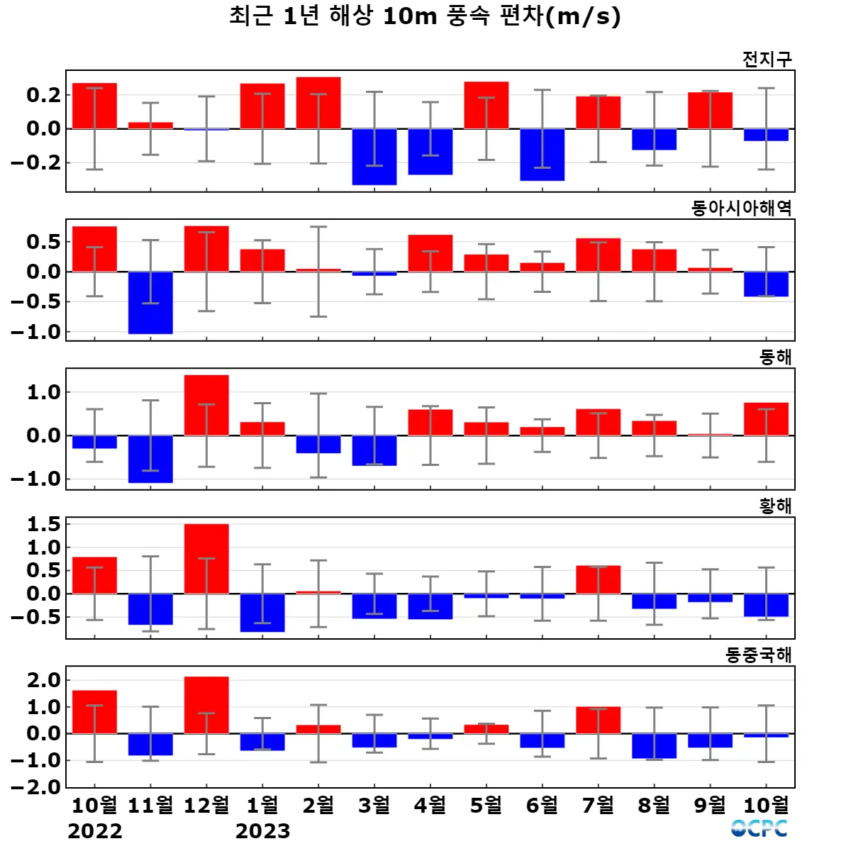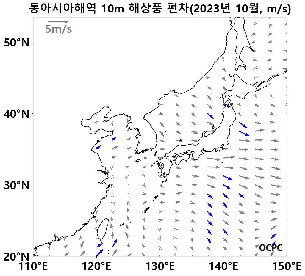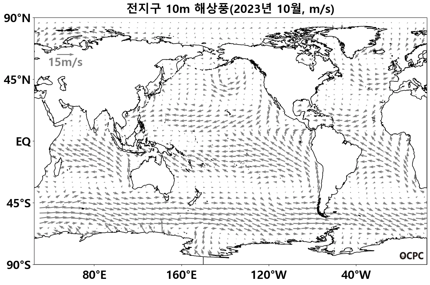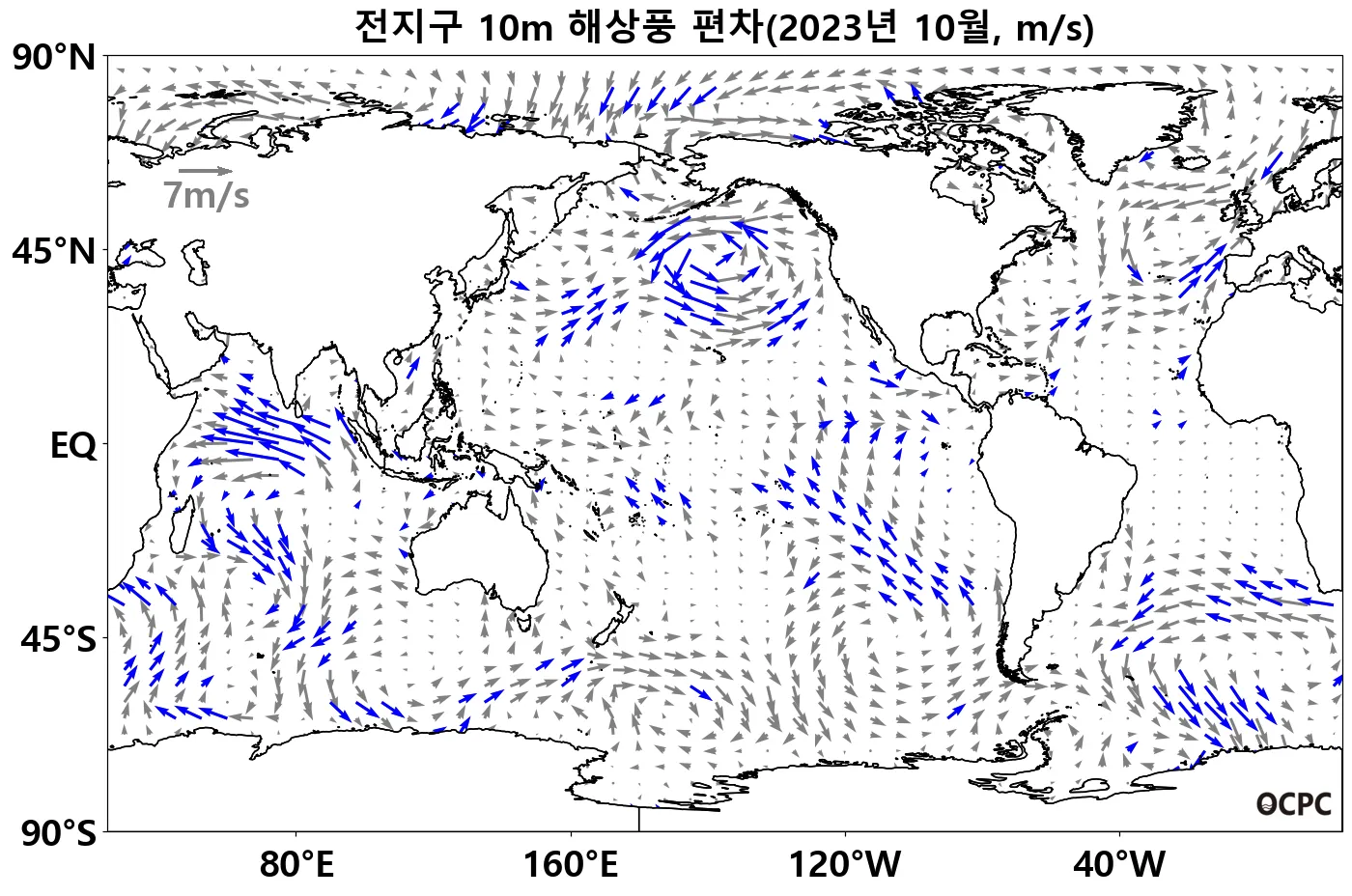 전지구 10m 해상풍 편차에서 인도양 쌍극진동의 발달에 따른 동서 기온차이에 의해 상대적으로 강한 해상풍이 발달한 것으로 추정됩니다.