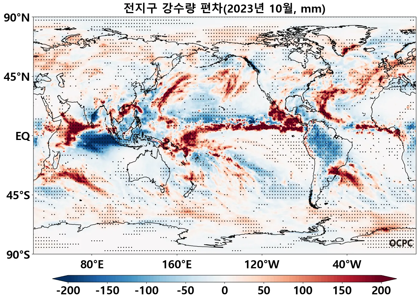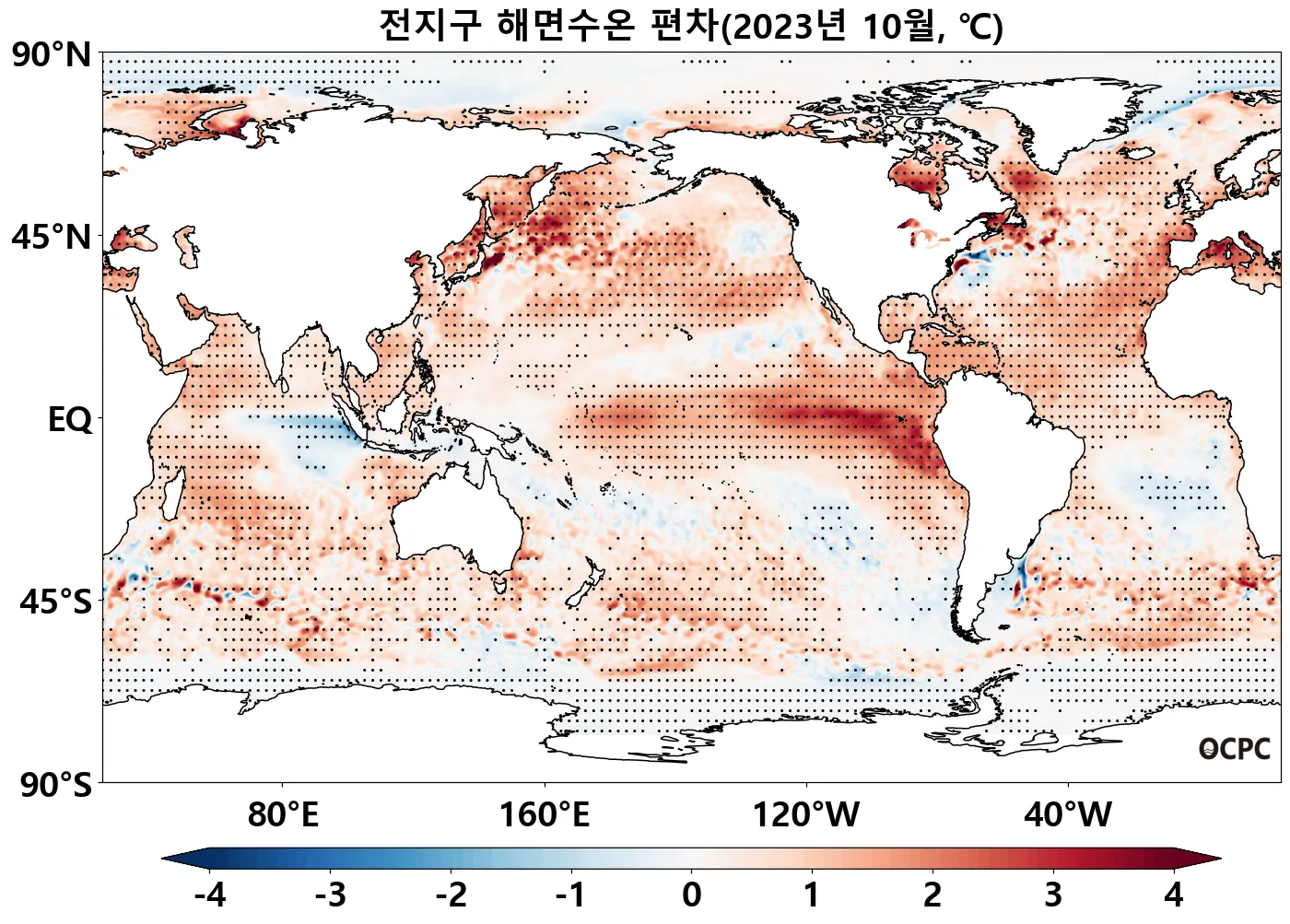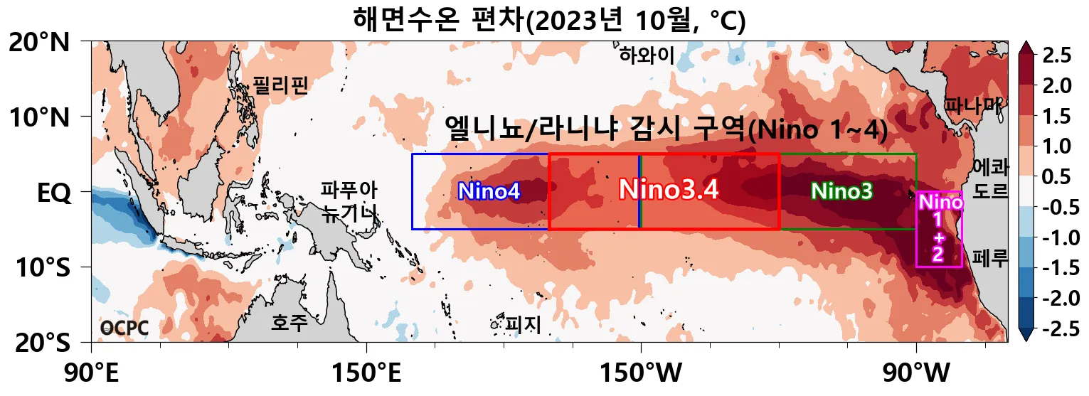 엘니뇨/라니냐 감시구역인 열대 태평양 Nino3.4 해역(5°S~5°N, 170°W~120°W)의 10월 평균 해면수온 편차는 1.6°C, Nino1+2해역(10°S~0°, 90°W~80°W)은 2.4°C로 엘니뇨가 강하게 발달하고 있습니다.