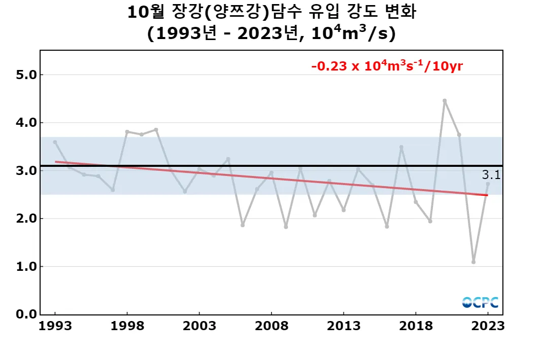 1993~2023년 동안 10월 장강 담수 유입 강도는 10년에 초당 2,300톤(한 달 동안 유입된 담수량으로 환산하면 10년에 6.2기가톤)씩 감소하는 추세입니다.