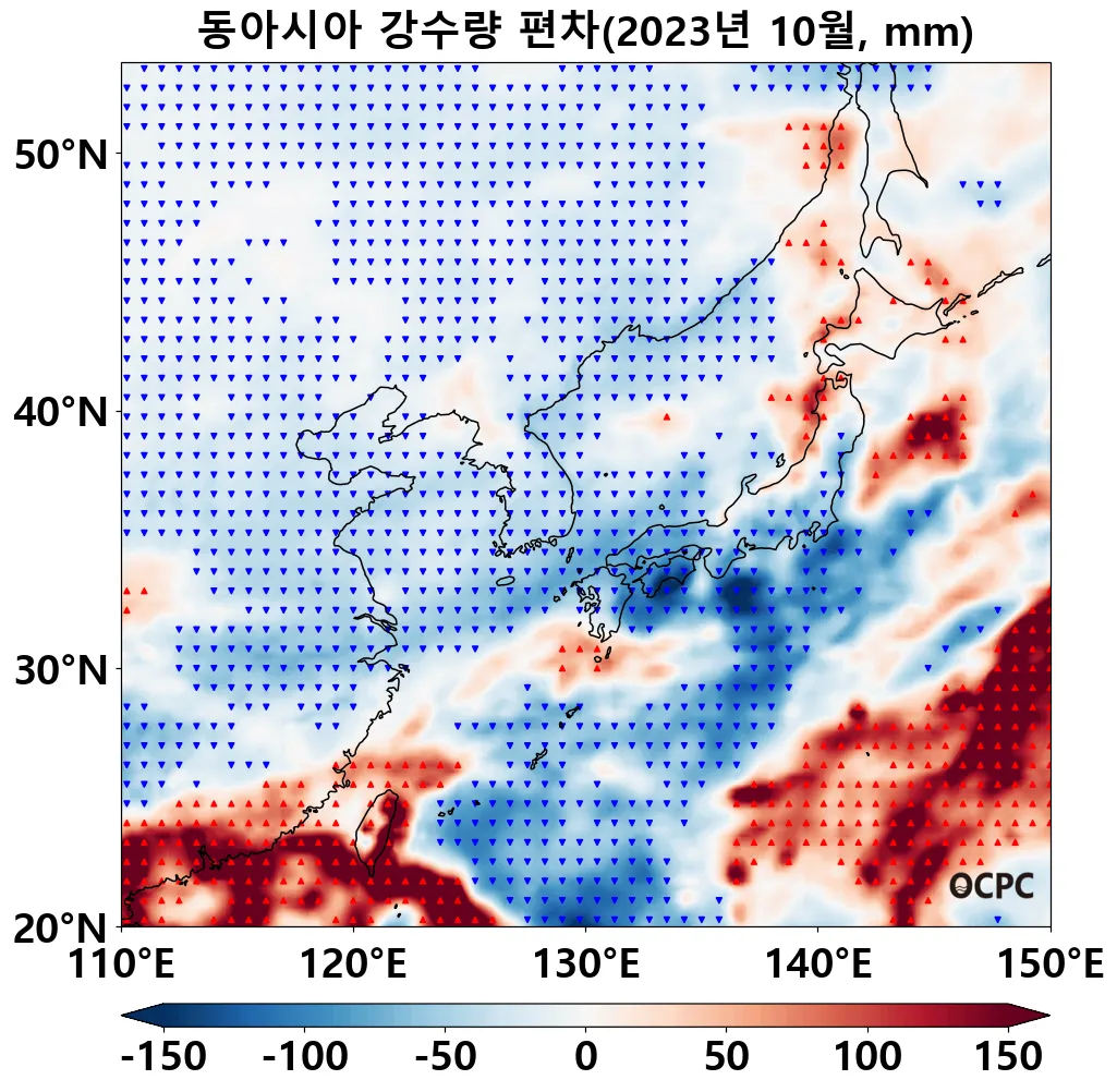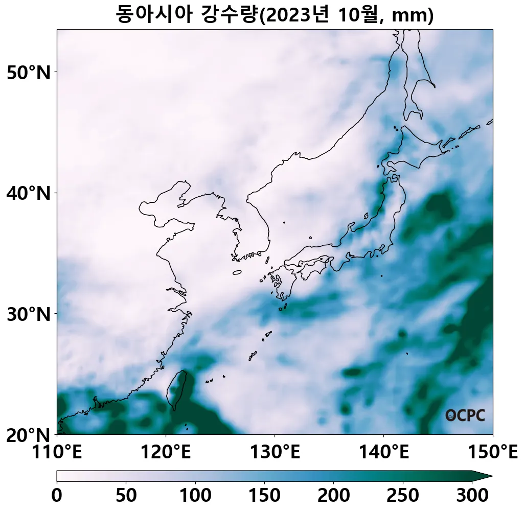 중국 장강 유역(110~120ºE, 29~32ºN) 월누적 강수량은 평년보다 낮으나 평년보다 많았던 9월 강수량의 영향으로 장강 담수 유입량이 소폭 증가한 것으로 판단됩니다.