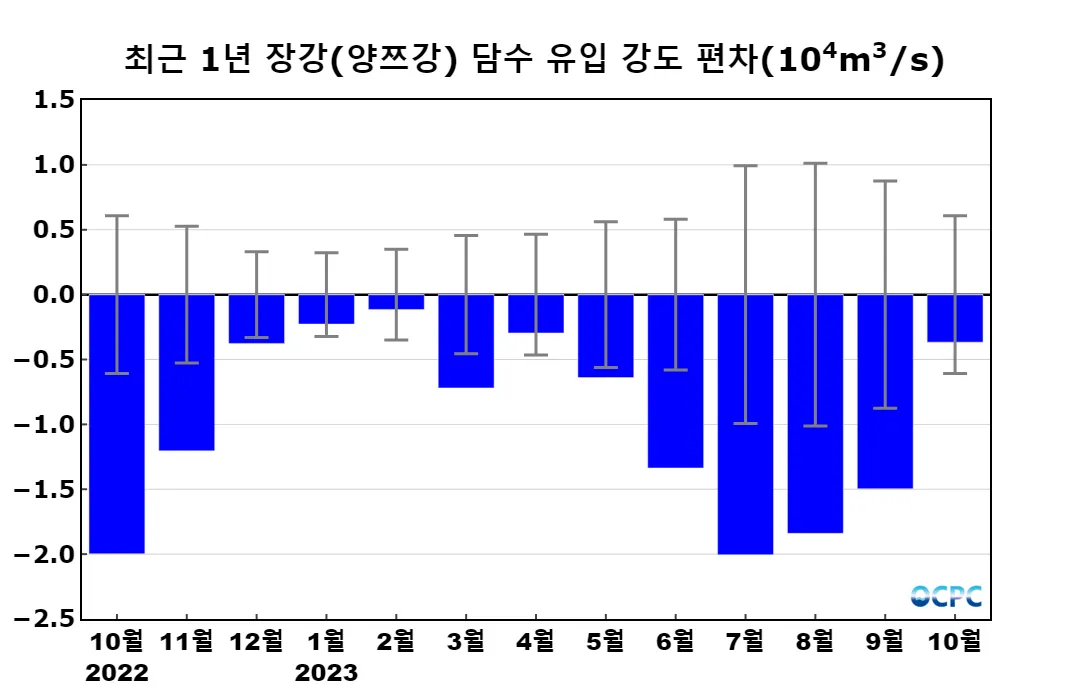 장강(양쯔강)으로부터의 담수 유입 강도는 초당 27,228.9톤으로 평년(초당 30,890.1±6073.2톤)보다 11.9% 감소했지만 평년과 비슷하게 회복되었습니다.