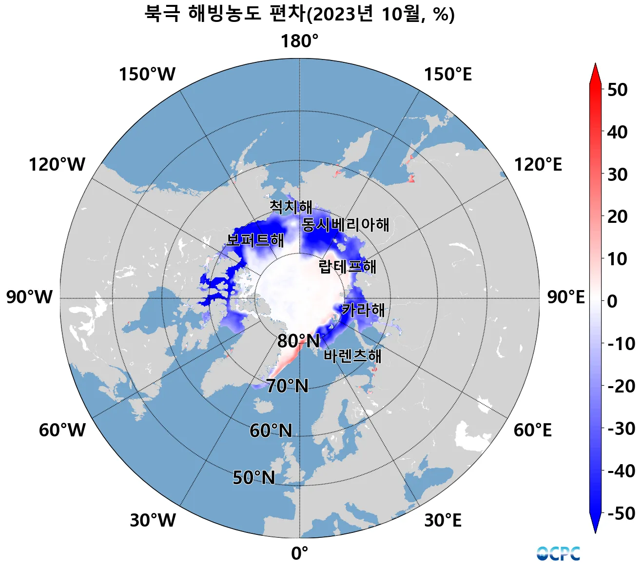 그린랜드 동쪽 해역을 제외한 북극의 모든 해역에서 평년보다 해빙농도가 감소했으며 특히 바렌츠-카라해, 보퍼트해, 척치해 일부지역에서 여전히 해빙이 15% 미만으로 해수면이 드러난 상태 입니다. 또한 지난 7월 폴리냐가 발달했던 동시베리아해에서 해빙 증가가 다른 지역에 비해 느리게 진행되어 동일한 지역에 폴리냐의 발달을 확인할 수 있습니다.